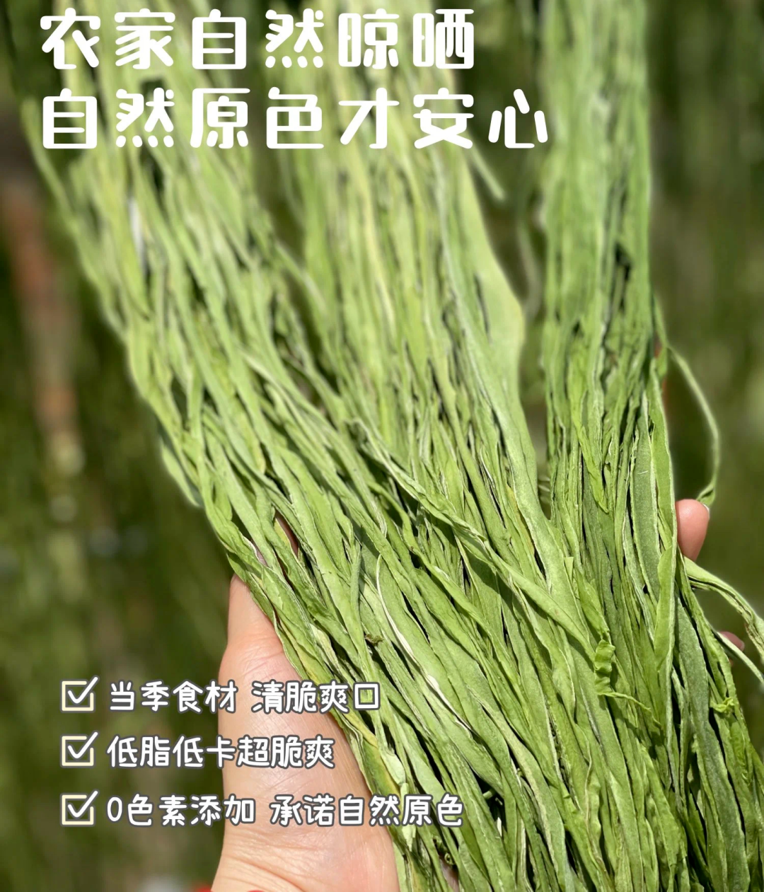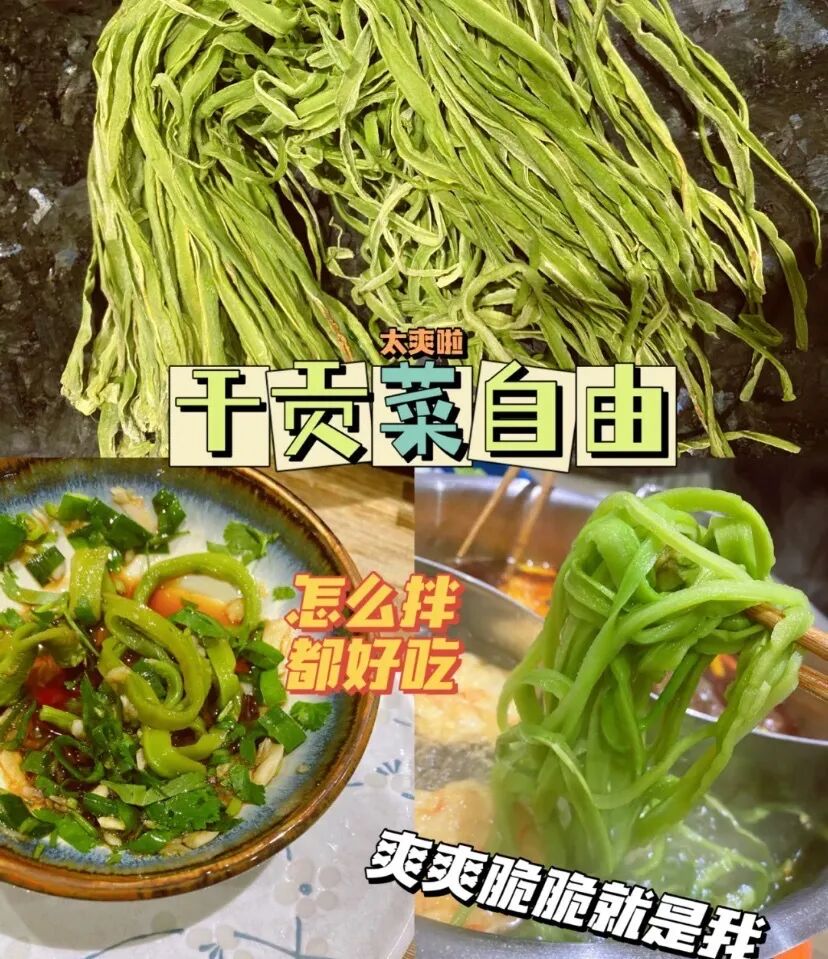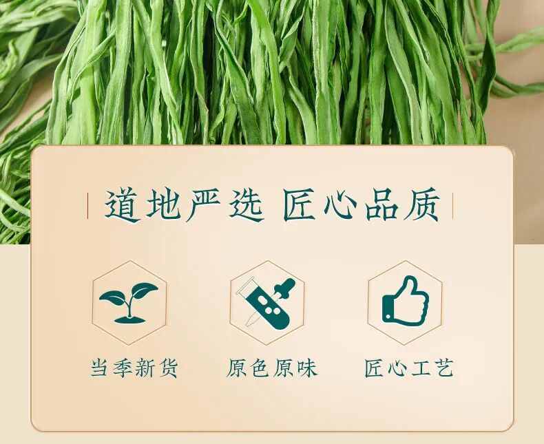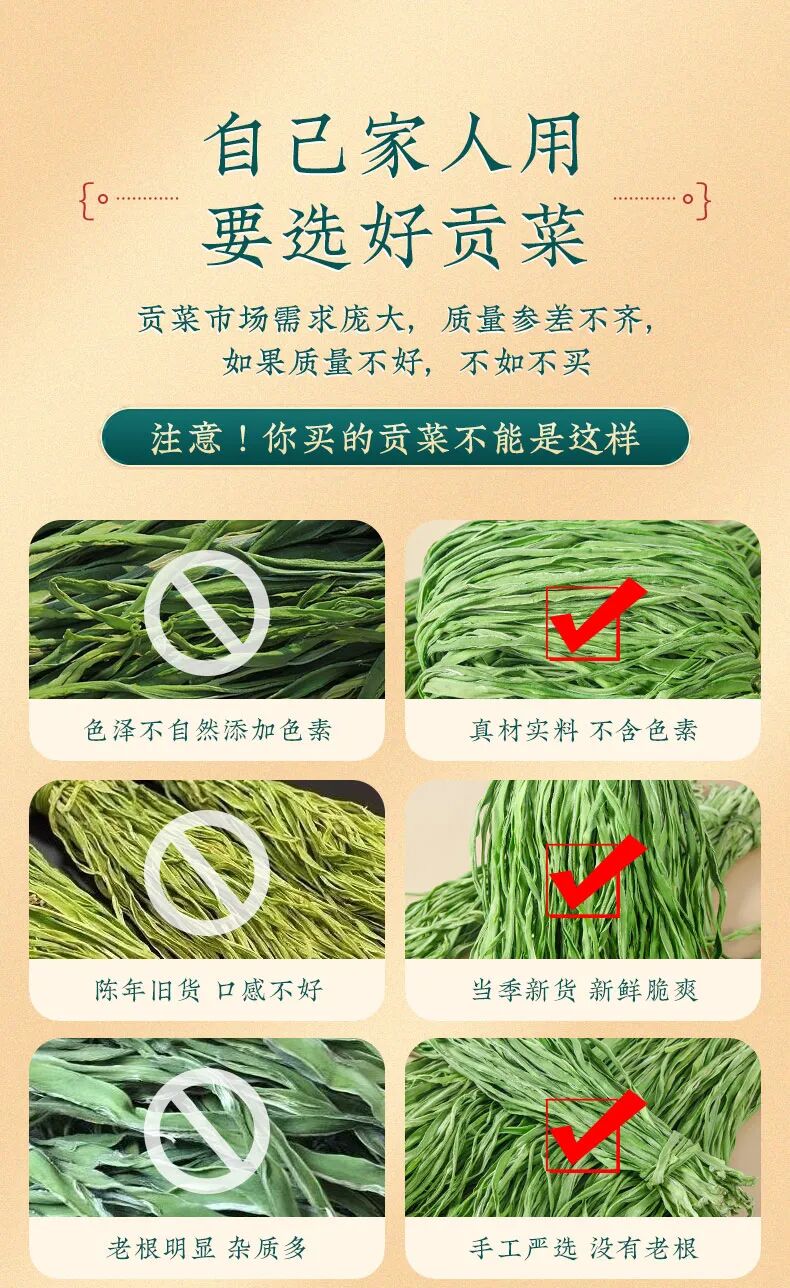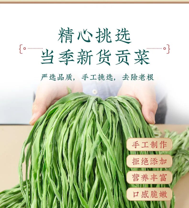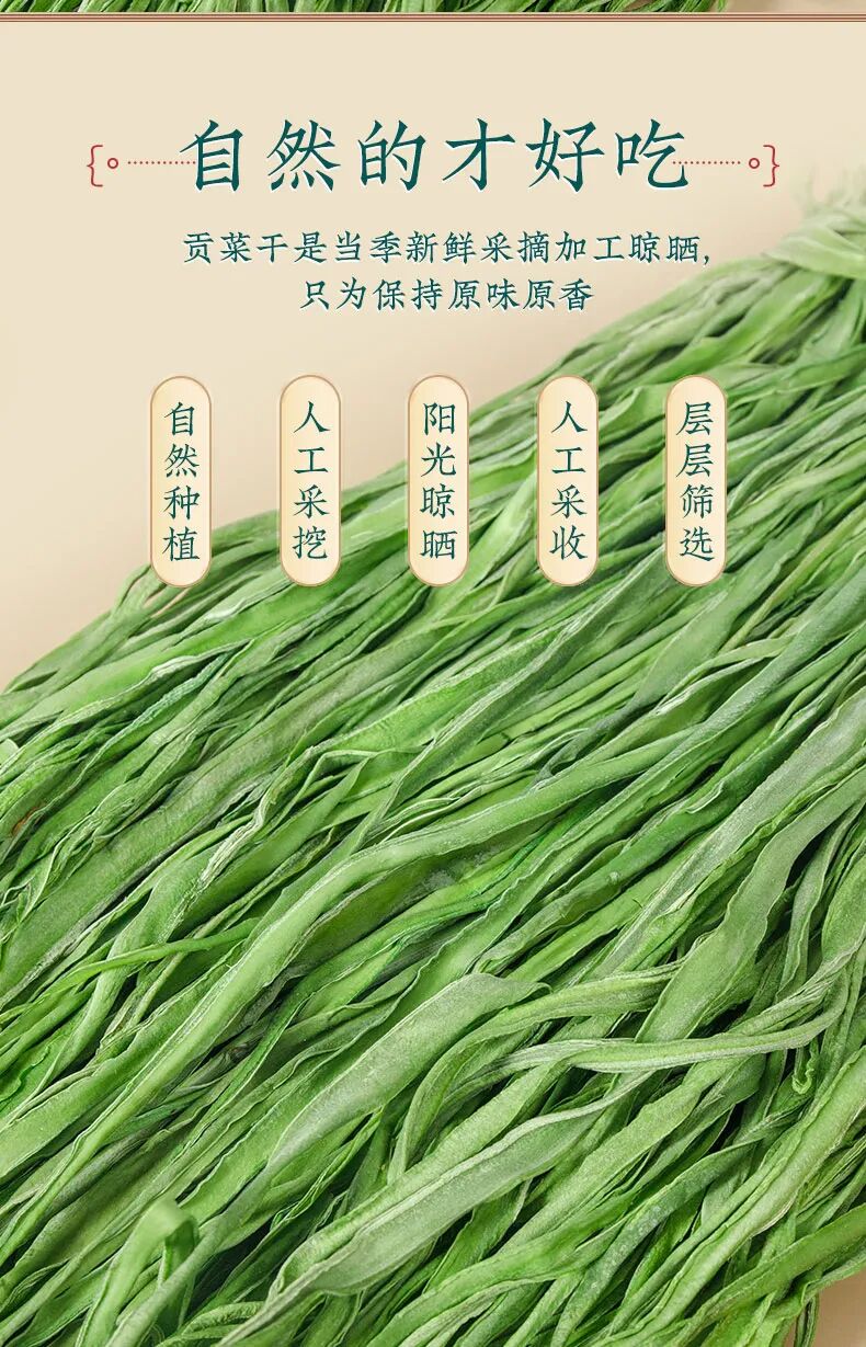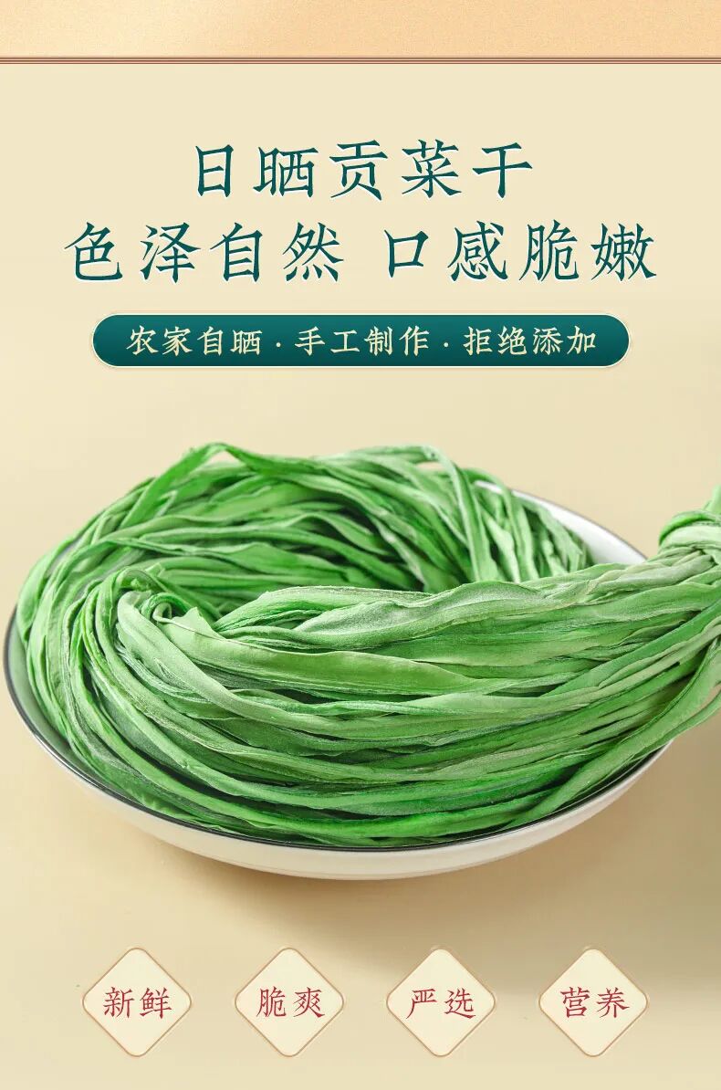 【团品】纯手工贡菜干 【规格】50g/袋*1 50g/袋*3 50g/袋*5 【生产日期】2024年12月20日(一般为最近半个月日期) 【保存期限】冷冻365天 【售后处理】产品有质量问题,请在收到产品的24小时内拍照快递面单+产品图发至客服,进行售后。非质量问题需承担退回运费! 【开团】12月30日 10:00 【零售价】19元/袋 起 【团购价】12.9元/袋起 【邮费】海南 北京 云南 黑龙江 青海+1元/单,新疆 西藏+12元/单 【快递】邮政 【发货地】安徽亳州 数量有限,售完即止~ 皇家贡品【贡菜】YYDS?? 建议大家最近把晚餐都换成贡菜!好吃还减肥! 好吃又爽口开胃小菜,怎么做都爽口,怎么都好吃 今年的贡菜干超级的嫩,一直保持脆感 凉拌、涮火锅、炒肉丝、做酱菜、 搭配螺狮粉、火鸡面等多种吃法。 性价比超高,也可以送礼送人! 纯手工制作,削皮、开条、自然光照下晒干, 自然晾晒之后纹理清晰,色泽自然,无色素添加 食用方式:冷水泡发30分钟左右(中间要换水), 可凉拌食用,可烹饪后食用,也可作为火锅伴侣涮锅食用。 注:因产品特性,非质量问题不支持退换,望见谅。 (贡菜去白头,去黄条,精选翠绿色一级品质) 贡菜,新鲜,义门苔干久煮不烂,一直保持脆感, 凉拌,火锅涮菜,苔干炒肉等多种吃法。 性价比超高,也可以送礼送人 干贡菜怎么做好吃 这款来自安徽的特产——贡菜干推荐给你们, 你可别小瞧它,看似毫不起眼的贡菜在清朝却是年年进贡朝廷的贡品, 因而谓之“贡菜”。后又因为其食起来有“嘎嘎脆”的声音, 被周总理称为“响菜”。 其贡菜是一种叶状蔬菜,经过去叶去皮晒干后的成品, 跟木耳一样,虽然是干菜,但经过泡发后就会膨胀, 颜色会变得翠绿翠绿的,吃起来清脆爽口,食用方便。 义门苔干产于安徽涡阳义门镇,至今已有300多年历史 泽翠绿,响脆有声,味甘鲜美,爽口提神,好吃到停不下来! 它的每一个名字背后,都有一段故事。苔干,是最早的名字。 那时它出身安徽涡阳,也盛产于江苏邳州 以清新素雅、响脆爽口而闻名。 后来,好吃的名头传到了宫里,这不起眼的绿贡菜最大的特点,就是脆。![]()
