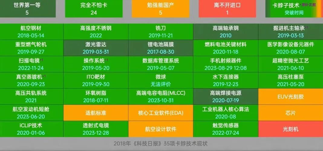 2018年4月起, 《科技日报》推出了一系列专栏, 叫《是什么卡了我们的脖子 ? 亟待攻克的核心技术》,共35项“卡脖子”技术,它们分别是: