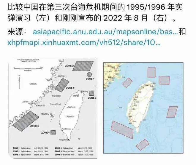 我们再来看看,这些年中国军演范围变化:2022年8月的军演范围比1996年台湾危机时候的范围更广。