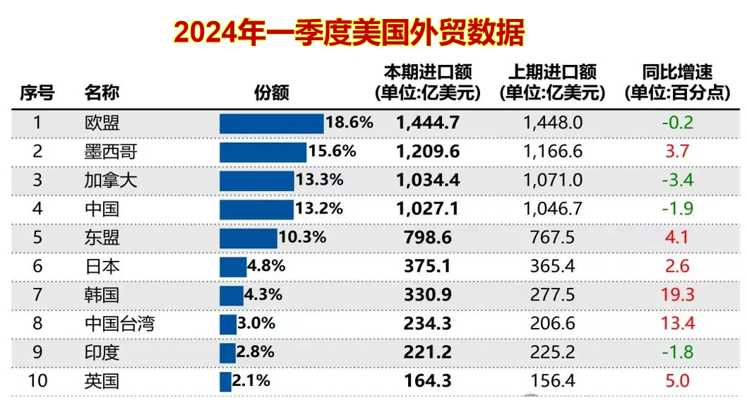 2024年一季度,美国从中国进口1027亿美元的商品,排在欧美、墨西哥和加拿大的后面。