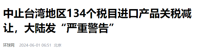 2024年5月31日国务院关税税则委员会发布关于中止《海峡两岸经济合作框架协议》(ECFA)部分产品(第二批)关税减让的公告,决定自2024年6月15日起,对原产于台湾地区的134个税目进口产品,中止适用ECFA协定税率。