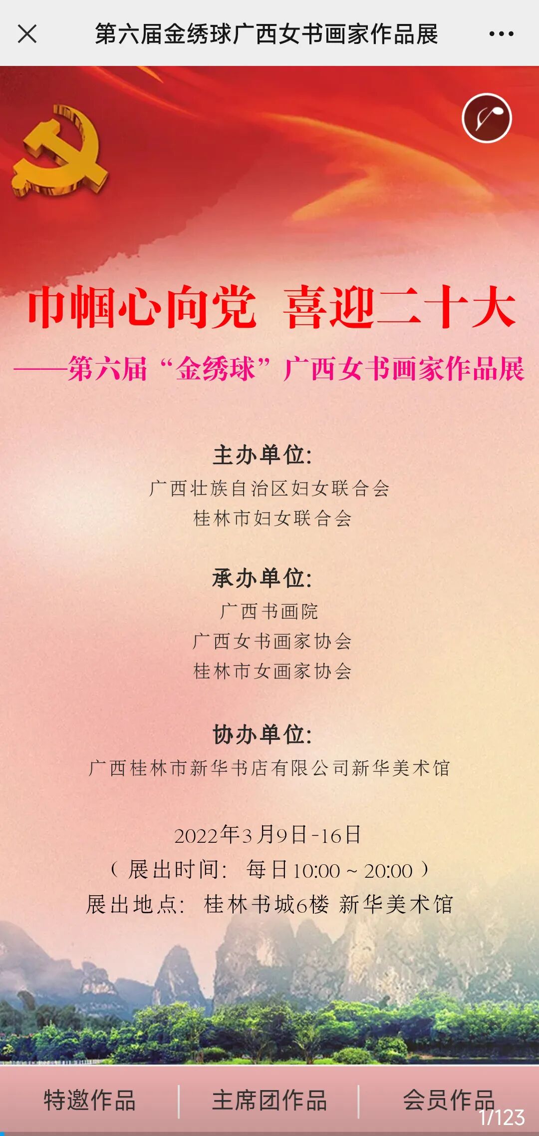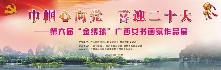 3月9日,由自治区妇联、桂林市妇联主办,广西书画院、广西女书画家协会、桂林市女画家协会承办,桂林市新华书店有限公司新华美术馆协办的“巾帼心向党 喜迎二十大”——第六届“金绣球”广西女书画家作品展在桂林书城六楼桂林新华美术馆拉开帷幕。自治区政协副主席何辛幸出席活动并宣布开展。