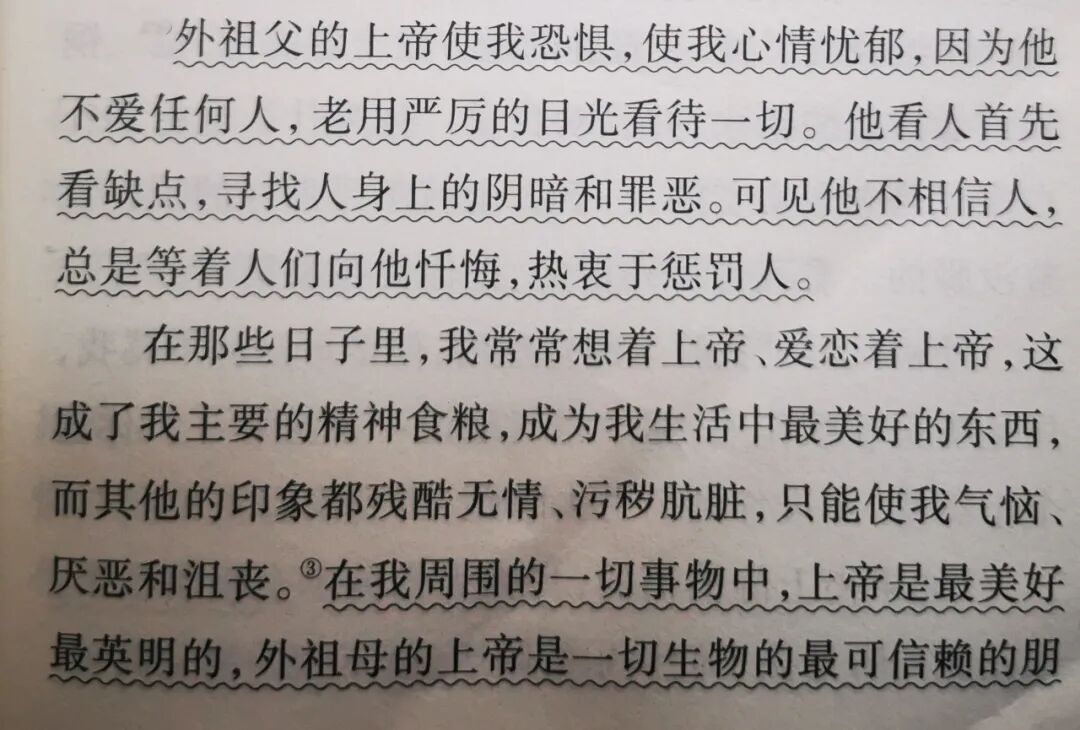 阿廖沙觉得,在外祖父和外祖母心中,住着两个不同的上帝。外祖母善良、博爱、仁慈,所以她几乎每天早晨都用新的词语赞美圣母;在外祖母看来,动物都有上帝,上帝是以慈悲为怀的;在阿廖沙的心里,外祖母的上帝容易理解、不可怕,但不能对他说谎话,对上帝说谎是可耻的。而外祖父的上帝是残酷的、残忍的、残暴的。他不是用爱来关爱世界,而是用武力来征服世界。外祖父对阿廖沙说:“人们犯了罪,就得淹死;再犯罪,就得烧死,他们的城市得毁灭。上帝用饥饿和瘟疫惩罚人们,他永远是用宝剑统治人间、用皮鞭对付恶人。”