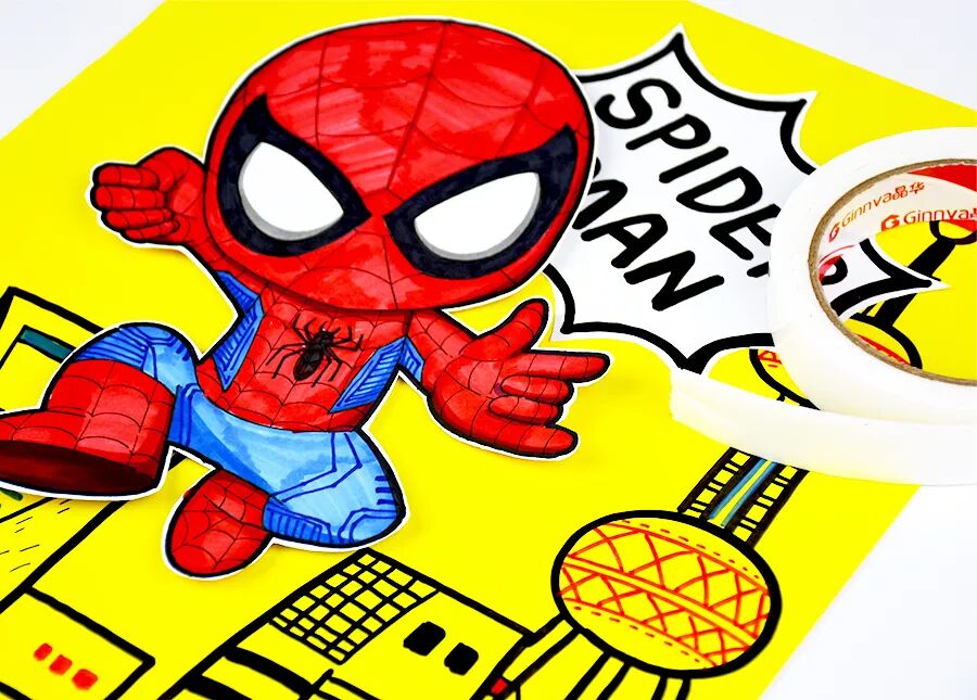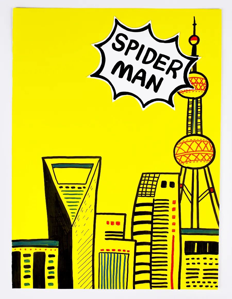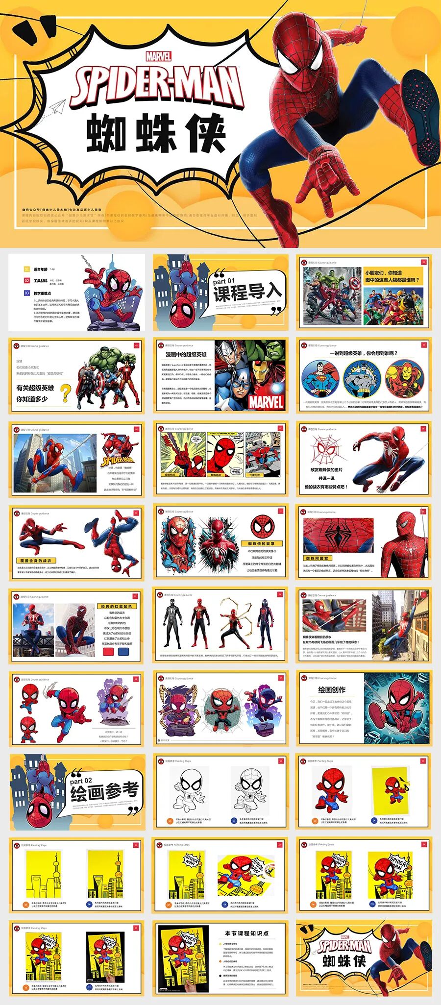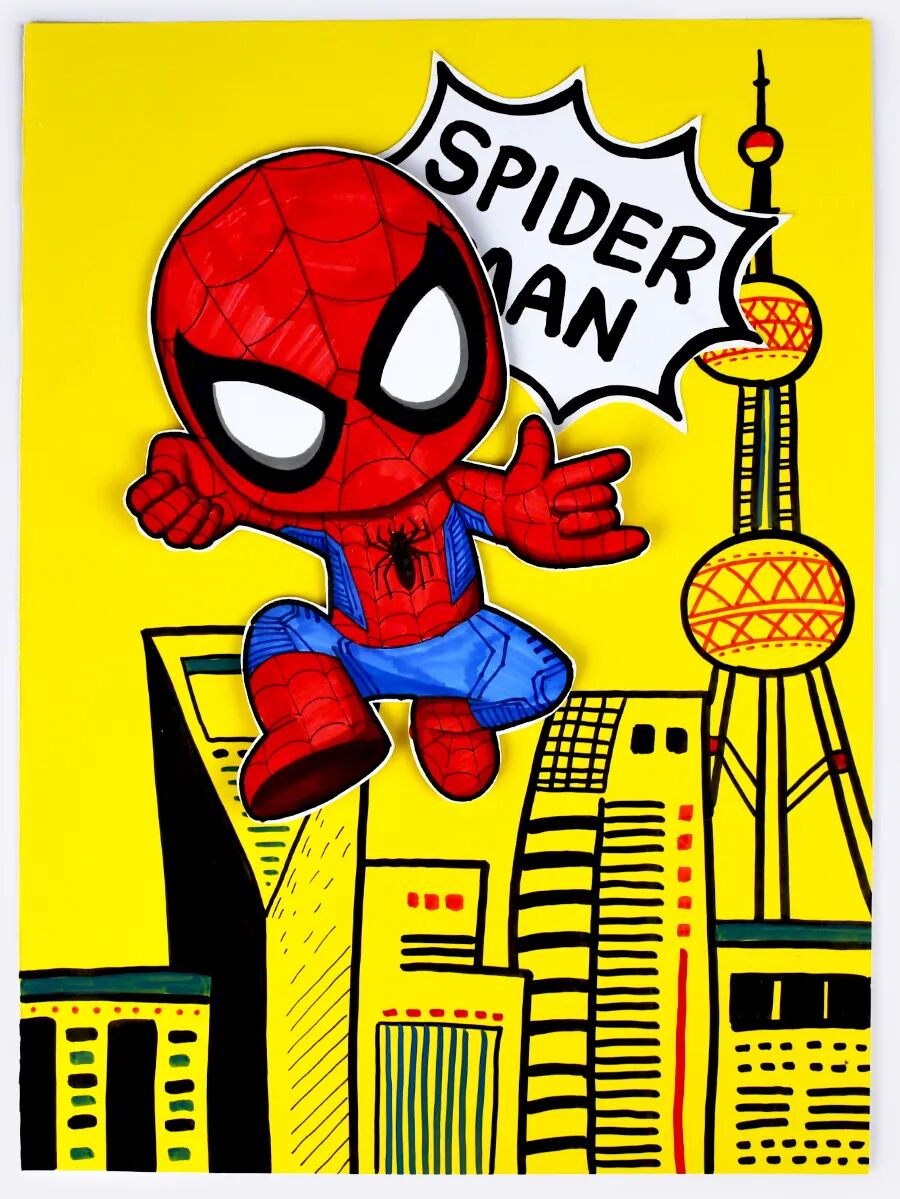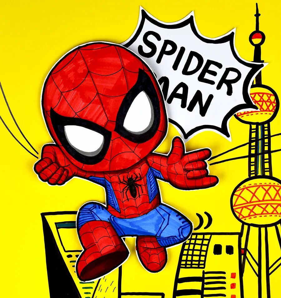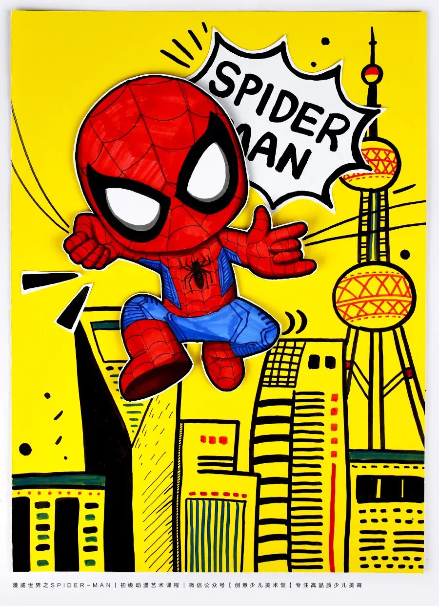 小朋友们,你们听说过一个特别酷的超级英雄吗?他穿着红蓝相间的战衣,面具上有两个大大的白眼睛,看起来炯炯有神。他就是——蜘蛛侠! 蜘蛛侠的故事发生在纽约。有一个普通的男孩叫彼得·帕克,有一天,他被一只神奇的蜘蛛咬了一口,从此就拥有了“蜘蛛的力量”!他变得超级强壮、动作特别灵活,还能像蜘蛛一样爬墙,甚至可以发射蛛丝,在高楼大厦间轻松飞来飞去,简直太神奇了! 不过,蜘蛛侠厉害的不仅是这些本领。他还是一个正义感满满的英雄呢!每当人们遇到危险或需要帮助时,他总是第一个站出来,用勇气和智慧保护大家。这也是为什么那么多人喜欢他,大家都觉得他特别值得尊敬! 今天,我们在美术课上要用画笔来描绘这位超级英雄!想象一下,你会把蜘蛛侠画成什么样子呢?是摆出炫酷的动作,还是在城市上空飞翔呢?让我们一起走进蜘蛛侠的世界吧! 人物形象与特征 了解蜘蛛侠的经典形象,观察他的红蓝战衣、面具和蜘蛛图案等独特特征,学习通过颜色和细节来表现超级英雄的鲜明特点。 人物动态的表现 学习用肢体动作来表现人物的动态,培养孩子们对人物动作的理解,通过姿势和动作展现蜘蛛侠的灵活和力量感。 建筑背景的绘画 运用简单的线条和形状绘画建筑背景,通过黑白对比的背景,让蜘蛛侠的形象视觉感更加突出,使画面更具表现力。 在绘画过程中,鼓励学生加入个性化创意,让蜘蛛侠摆出自己设计的动作姿势,比如飞跃、攀爬或准备出击等。在涂色环节,提醒学生关注蜘蛛侠鲜明的红蓝配色,指导他们在战衣的特定区域合理运用这些颜色,掌握红色和蓝色的搭配方法,并用黑色线条勾勒蜘蛛网图案,使蜘蛛侠形象更加鲜明、具有辨识度。 使用黑白线描的方式创作背景,学习通过不同线条来展现建筑的独特风格。在绘制建筑时,鼓励学生添加小圆点或方块作为窗户,并通过填充多样的线条和色块来丰富建筑细节,使城市背景更具层次感。 背景完成后,将红蓝相间的蜘蛛侠贴在城市背景上,引导学生观察彩色的蜘蛛侠与黑白背景之间的对比效果,体验色彩对比带来的视觉冲击力,理解如何通过对比来突出画面中的主体人物。 用记号笔在纸上绘画出蜘蛛侠的造型 细心地表现出蜘蛛网战衣上的蜘蛛网纹 在对应的区域内涂上蜘蛛侠鲜明的色块 并准备一张黄色的卡纸 绘画出高低错落的各色建筑 用点线面和色块进行丰富 表现窗户等细节以及装饰的花纹图案 还可以写上与主题相关的文字 布置粘贴在画面背景合适的位置 准备一卷泡沫胶 将剪下来的蜘蛛侠固定在画面合适的位置 泡沫胶具有一定的厚度 能突出主体并增添画面的层次感 来增添画面的动感和生动性 这样酷酷的城市英雄蜘蛛侠就画好啦 点击“阅读原文”获取《蜘蛛侠》PPT课件