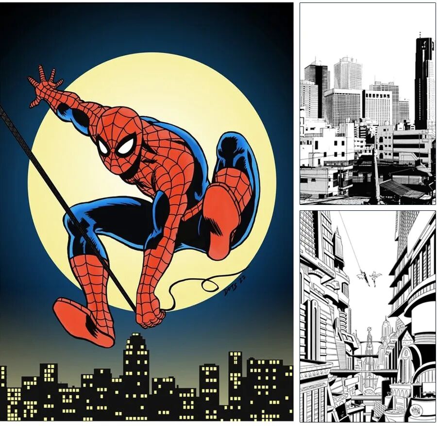 2.运用多样的线条描绘城市高楼大厦,通过黑白与彩色的对比突出主体人物,使蜘蛛侠在城市背景中更加显眼。