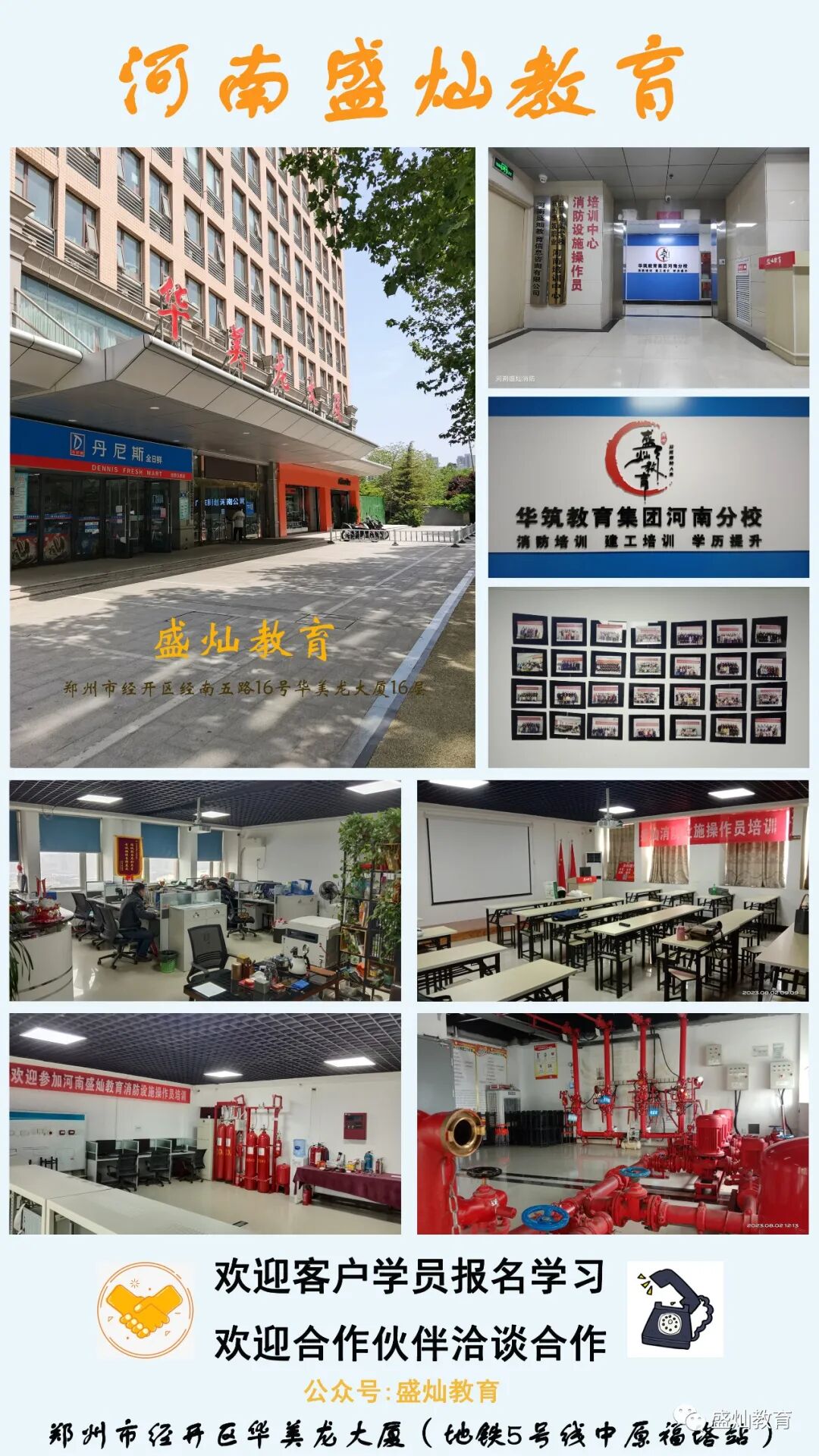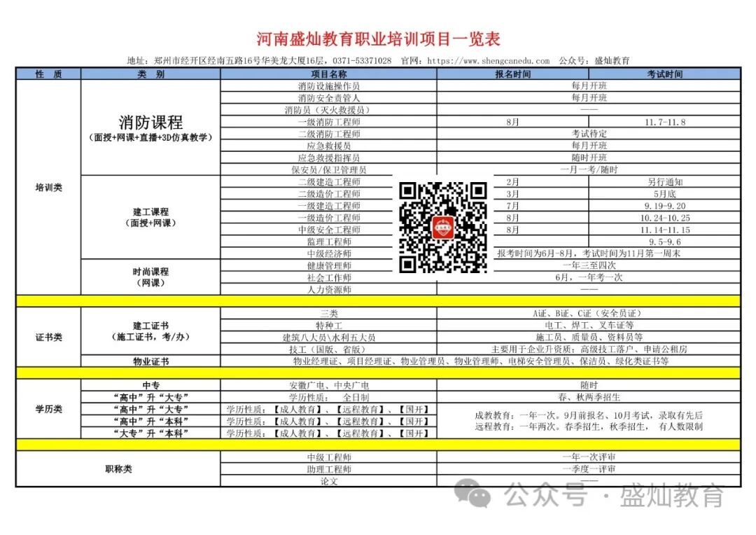 河南盛灿教育长期致力于“消防安全”、“应急救援”、“物业行业”及“学历提升”等培训或取证项目:消防设施操作员、消防安全责管人、消防讲座;保安员、保卫管理员、企业安全员;应急救援员、应急救援指挥员;消防工程师、安全工程师;学历提升、职称评定;三类、八大员、特种工、物业经理证、项目经理证、电工焊工、电梯管理员及一些评价类证书。
