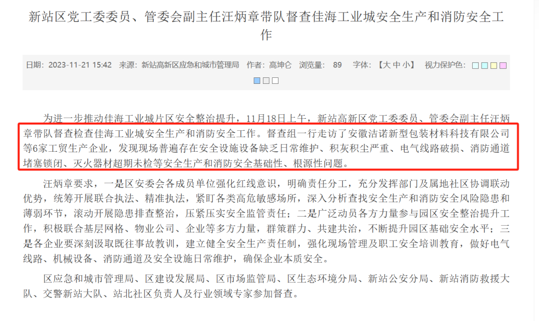在2023年11月21日,佳海工业城在政府部门的检查过程中,就曾被发现安徽洁诺新型包装材料科技有限公司等6家工贸生产企业,普遍存在安全设施设备缺乏日常维护、积灰积尘严重、电气线路破损、消防通道堵塞锁闭、灭火器材超期未检等安全生产和消防安全基础性、根源性问题。