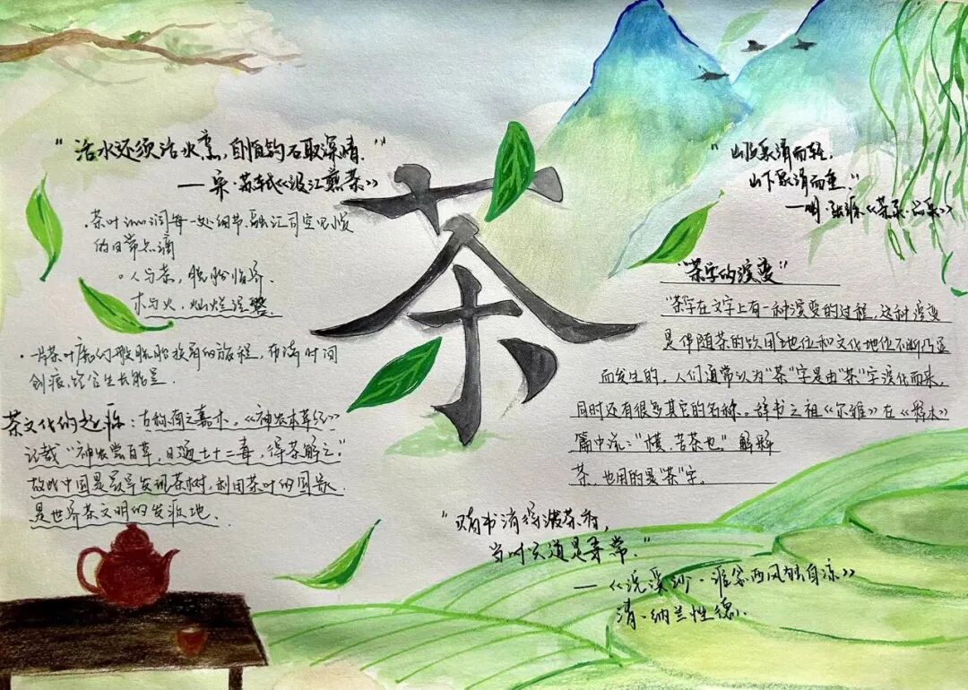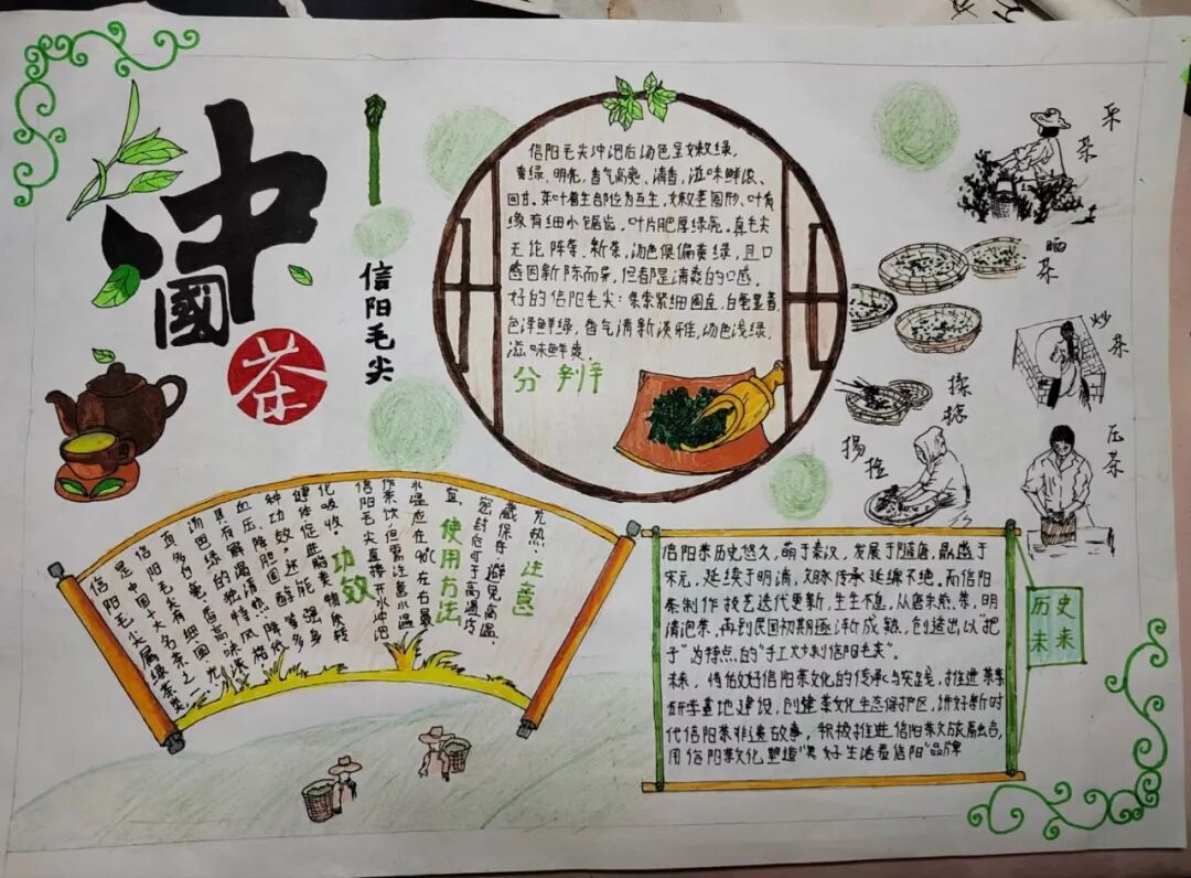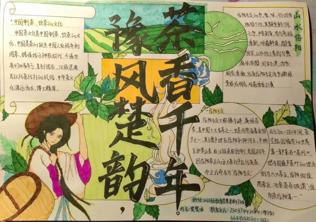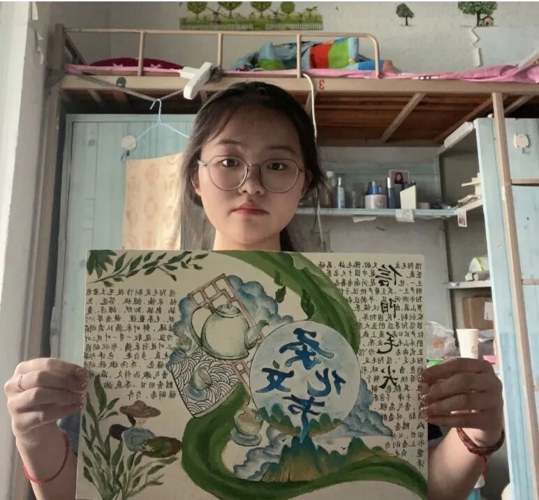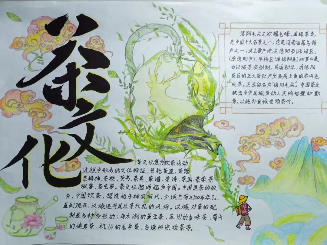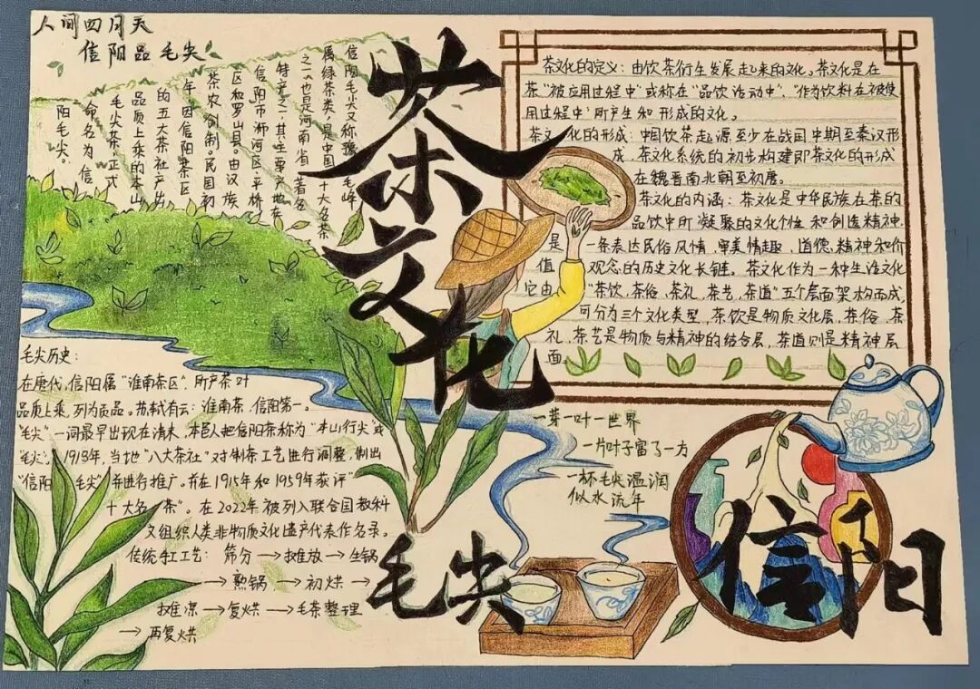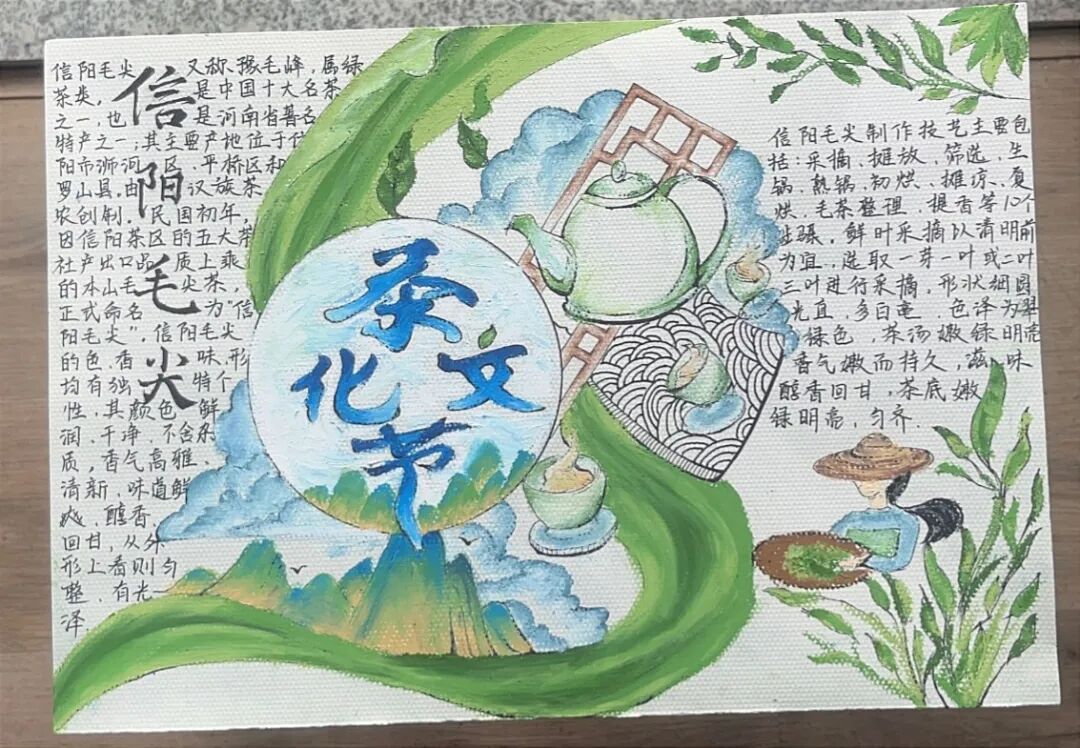 获奖作品展示 信阳茶文化源远流长 距今已有两千多年的历史 一杯茶的绽放 牵动着一座城的开放 信阳茶文化节已经成为 信阳面向世界的招牌 为“美好生活看信阳” 写下了生动注脚 为了使同学们更加融入中国传统文化 加深对中华传统文化的了解和热爱 学校开展本次茶文化活动 提高学子们对茶文化的了解 使茶文化得到创造性转化 和创新型发展 下面是本次活动的 一等奖 二等奖 三等奖 的获奖作品 一起来围观下吧 22教育本07贾雯冰 “豫风楚韵,茶香千年” 22教育本08沈昱含 “茶文化” 21教育本04姚倩 “茶文化” 22心理本02杨钰茜 “以茶为媒,领略信仰之美” 22教育本02安梦琦 “茶文化” 21小教本03刘婉婷 “信阳茶文化” 22学前本01朱歌雯 “茶文化” 22教育本05李盈辉 “信阳茶文化” 22学前本01帖子悦 “中国茶——信阳毛尖” 信阳 茶文化 信阳茶文化作为 中华优秀传统文化 具有非常高的文化价值 我们要积极探索 信阳茶文化的独特魅力 做中华优秀传统文化的传承者 本次一至三等奖作品 有没有戳到你的心巴 让我们期待一下明天的优秀奖吧 编辑:王佳欣 校对:杨欣雨 葛瑞文 审核:白鹭
