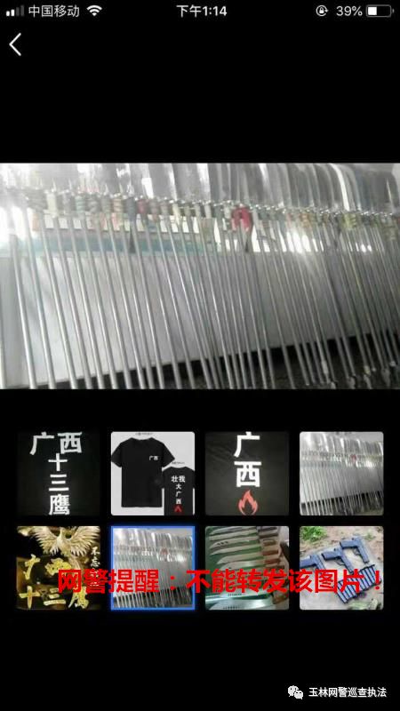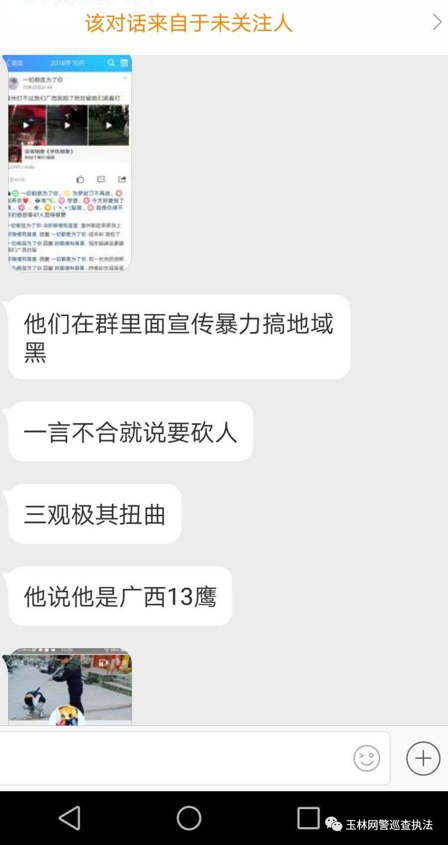 近日,不断有网民通过新浪微博私信向我们网警巡查执法账号举报名为“广西十三鹰”的疑似涉黑团伙,尤其是其中的“广西十三鹰老六”最为活跃,其不断地在QQ空间和QQ群内上传发布管制刀具、枪支以及一些年轻人手持大砍刀等器械准备聚众斗殴的暴力视频。看图说话。
