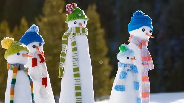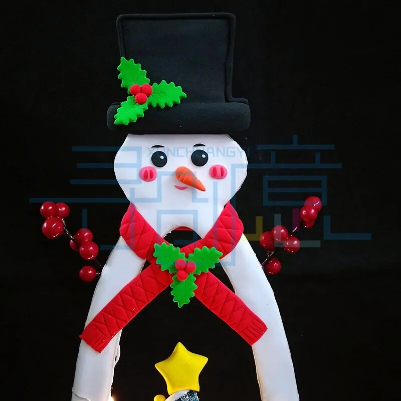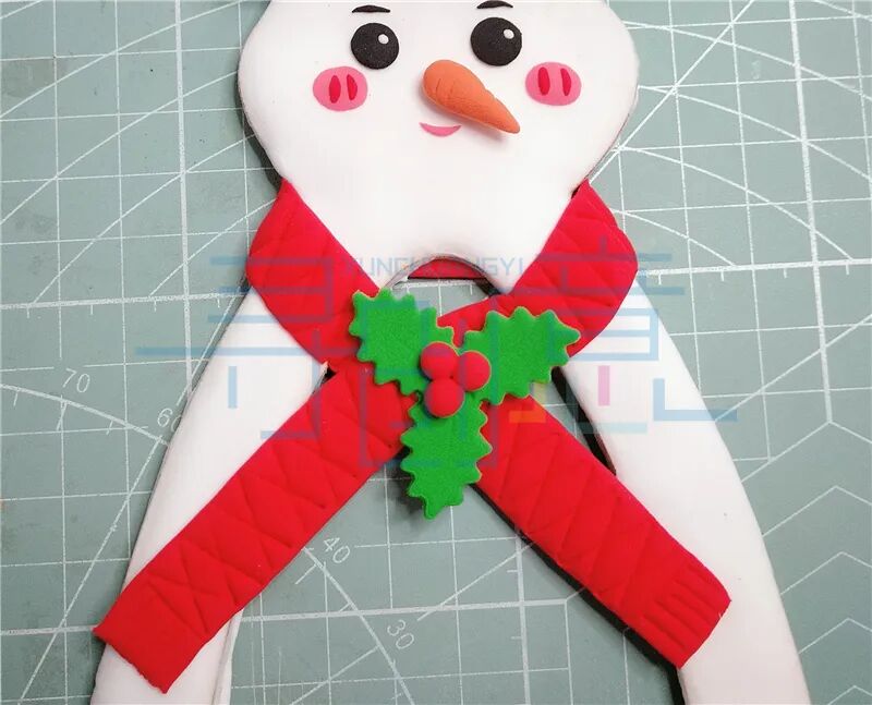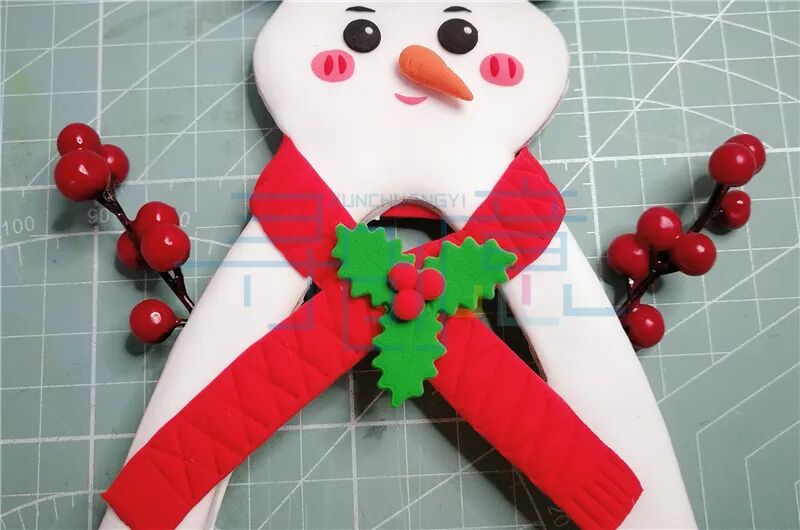 给雪人围上围巾,并且用绿色圣诞叶装饰