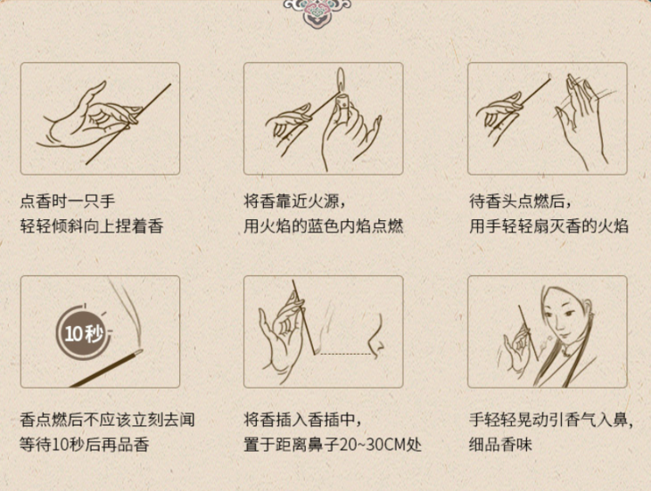 点燃后,青烟慢慢升腾,香气扩散得快且均匀,连衣服、发丝都会染上若有似无的暗香。品茶、写字、读书、赏画时,皆可于静室中焚上一柱。屏气凝神,思接千里,收获另一番闲情逸致。线香的神奇只有体会过的人才知道,静心舒心的感觉让我久久不能忘怀,点香的时刻,我会觉得我是这个世界的幸福人。