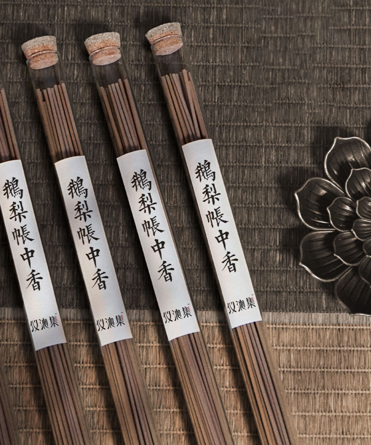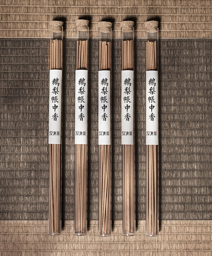 李商隐曾写:“舞鸾镜匣收残黛,睡鸭香炉换夕熏”。到了夜晚,古人在床帐中焚熏的香品。这种香,便是“夕熏”,又叫“帐中香”。相传,此香为南唐后主李煜夫人周娥皇所制,代表了夫妻二人的绵长情谊。最早在唐代冯贽的《南部烟花记·帐中香》里被提及:“江南李主帐中香法,以鹅梨蒸沉香用之”。春夏交替,总感觉一丝烦闷,就想着让房间里有点味道。种草了很久的线香,终于到货了。与气味浓郁的化学线香不同,我手上的这根“鹅梨帐中香”,出身不凡。香材,包括沉香、檀香、降真香等十几种自然原料,坚持手工熬制。