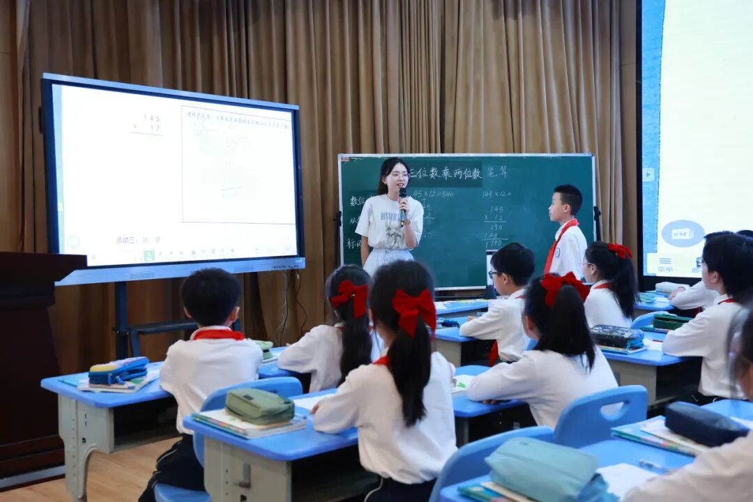 秋意渐浓,时光清浅。为了有效提高课堂教学效果,进一步落实双减政策,深入进行结构化教学研究,促进教师专业素养成长,近日,温州市市府路小学数学教研组活动暨陈小娜未来名师工作室联合活动如约开展。数学组全体教师参与此次活动。 本次活动包括研讨课、学情调研汇报、互动点评三个环节。 首先,由陈心怡老师和四(8)班的孩子们带来研讨课《三位数乘两位数》。 陈老师从复习旧知引入,对上学期学习的两位数乘两位数进行复习,充分唤醒孩子们的前认知经验,然后依据情境探究新知,借助计数单位来解释三位数乘两位数的算理,并渗透验算方法,发展学生的运算能力。紧接着陈老师引导学生思考以后可能还会学习几位数的乘法,建立多位数乘法的普适模型,最后练习环节迁移类推形成更加完善的认知结构,积累丰富的数学学习经验,发展了学生的模型意识。 第二个环节是由冯子晔老师带来学情调研汇报,冯老师详细介绍了前测单收集反馈的数据,发现学生对于新知算法的掌握难度并不大,但是对于算理的理解存在一定程度的偏差,因此总结得出本班在本节课教学过程中,应当注重将课堂重心聚焦笔算算理的渗透和思考,借助具体的生活化情境帮助学生理解每一部分乘积所包含的意义。学情调研对于这节课教学的开展提供了精准的数据支持和教学建议,准确地指向了学生的运算能力、模型意识等核心素养的发展。 第三个环节是年级段代表分组评课。首先南校区季鑫熠老师肯定了陈老师自然从容的教态,对课中的一些学生反馈的细节处理提出了更好的意见和想法。 北校区第一学段林微琴老师指出陈老师的课堂相比磨课精进许多,磨课更“磨”人,青年老师应多借助公开课提升专业素养。 第二学段林盈盈老师点评道运算能力的发展离不开老师学习活动的设计,同时推理意识的培养在本课中的体现也十分突出,值得自己学习。 第三学段岳舒静老师提出新课标中关注运算的一致性,本节课中也有建立模型意图突出一致性,对其中的反馈方式提出诸多中肯意见。 最后校级未来名师工作室导师陈小娜老师做了本学期工作室研修计划分享,工作室的小伙伴们明晰了后续工作的方向。 每一次的教研活动都是一次思维的挑战与成长的机遇。我们以培养核心素养为目标,以新课标理念为指导,以课程实施为抓手,加强教师对现行教材的深度研究和运用能力,全力提升教学质量与学生的综合素养。温州市市府路小学数学老师们将继续探索“结构化”教学,并落实到课堂中去。 THE END 撰稿:工作室第二小组 摄影:严添尹 编辑:邹婕妤 一审:教导处 二审:办公室 三审:校长室![]()