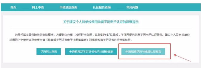 第二步:跳转页面后,点击申请纸质学历认证报告