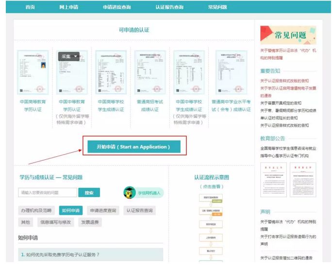 第一步:登录学信网学历与成绩认证页面,网(http://www.chsi.com.cn/wssq/)如果找不到页面的可以直接复制网址链接在浏览器打开,点击开始申请。
