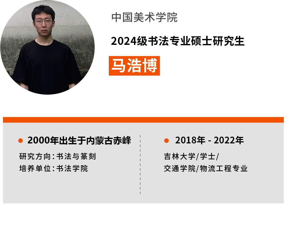 我本科阶段就读于吉林大学物流工程专业,属于工科,我所在的校区里也几乎都是工科专业,由此认识了很多理工科的同学。 马浩博尽管本科专业与艺术相去甚远,但在追求卓越、不断探索的精神上却是相通的。因此我在课余时间深入学习了书法理论,临摹古代碑帖,参加书法培训,随着学习的逐步深入,决定将其作为未来深造的方向。或许理工科所培养的看问题方式也会和学习艺术的人不一样,但这段经历也会带来看待艺术的全新视角或不一样的灵感,这需要我把自身独特的经验转变成当下所需的手段和工具。