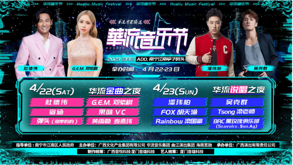2023南宁江南华流音乐节将于2023年农历三月三期间在南宁举办,艺人阵容包括邓紫棋、潘玮柏、吴克群、杜德伟等知名艺人参演,演出内容丰富。华流音乐节现场还将融入国潮十足的“华流星潮流文创市集街区”、特色美食区、户外帐篷区等好吃好玩的打卡点,打造丰富的视听盛宴。