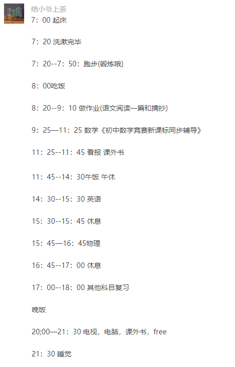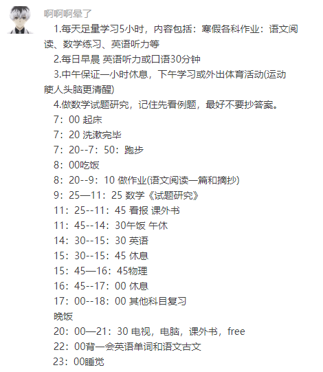 点击"班主任家园"关注我们 最近有很多家长在后台留言,让老师制定一个假期学习计划表: 今天老师就专门制定了#寒假作息#计划,希望能帮助到孩子们,做好科学的假期规划,度过一个快乐又充实的假期! 规划好寒假的每个阶段 寒假和暑假不一样,暑假可以直接按照时间顺序来安排学习和生活,寒假有一个盛大的节日——春节,所以必须按照实际情况来安排。 第一阶段:学习为主 时间:腊月二十八之前 按道理,本来经历了紧锣密鼓的复习和考试,假期开始应该让自己好好放松一下,但是由于春节的特殊性,如果此时过于放松,春节后你更会无心学习。 所以,在假期第一周,趁着学习的余韵还未散退,年味儿还没有那么浓,应以学习为主,完成部分寒假作业。其他安排也应与学习相关,制定好寒假的学习生活计划。 第二阶段:享受过年的气氛 时间:腊月二十八至大年初六 到了腊月二十八,年味儿已经非常浓了,在外工作的亲朋好友都回老家过年了,家家户户也都在大扫除,置年货,非常热闹。 这个时候,你会无心学习,可以让自己尽情享受过年的欢乐气氛。 年前帮父母置年货,年后走亲访友,感受我国的传统文化和浓浓的人情味儿。 第三阶段:收心为主 过了大年初六,年味儿稍微淡了一点,该走的亲戚也差不多走完了,开学也近在眼前。 这个时候,就不能放纵自己,让自己还沉浸在过年的欢乐中了,应该收收心,回归正常的学习状态,为开学做准备。 主要任务是调整作息时间,尽快适应学校的作息时间;检查寒假作业,没完成的作业尽快完成;预习新课,为新学期的学习做好准备。 规划好每一天的时间 先看看别的同学的寒假计划: 同学们可以借鉴上面的三个同学的学习计划哦! 初一、初二、初三寒假学习规划 01 初一年级寒假要点 语文: 1.阅读名著《骆驼祥子》《钢铁是怎样炼成的》; 2.两天一题文言文对比阅读,训练语感; 3.每天完成一篇记叙文训练,复习本学期学过的题型的答题技巧,同时养成在文中画重点的习惯; 4.语基比较薄弱的孩子可以翻阅本学期的试卷小测,进行错题的巩固复习。 数学: 1.学习进度较快的同学: (1)提前预习七年级下册: 记背课本蓝体字; 掌握课本例题(注意书写格式); 完成课后配套练习2-3题。 (2)可购买相关教辅,操练A类题,作为检测预习效果; 2.学习进度较慢的同学: (1)每2天做一道能力题,30分钟内完成; (2)题目完成后,核对答案,规范书写格式并对题型及方法进行归纳总结。 英语: 1.词汇:巩固七上的词汇,学有余力的同学可以背七下的词汇; 2.讲义:整理复习七上的讲义; 3.能力题:每天1-2篇阅读,每篇时间控制在5分钟之内; 4.听力训练:固定一个时间进行听力训练(时间为10-20分钟); 5.学有余力的同学可以根据自己的喜好,看英语课外读物(如英语时文等) (1)积累生词; (2)熟悉时事。 02 初二年级寒假要点 语文: 1.阅读名著《经典常谈》《钢铁是怎样炼成的》; 2.两天一题文言文对比阅读,积累文言文字词; 3.每天阅读一篇佳作,积累其中的好词好句好段; 4.语基比较薄弱的孩子可以翻阅本学期的试卷小测,进行错题的巩固复习。 数学: 1.学习进度较快的同学: (1)提前预习八年级下册: 记背课本蓝体字; 掌握课本例题(注意书写格式); 完成课后配套练习2-3题。 (2)可购买相关教辅,操练A类题,作为检测预习效果; 2.学习进度较慢: (1)每2天做一道能力题,20分钟内完成; (2)题目完成后,核对答案,规范书写格式并对题型及方法进行归纳总结。 英语: 1.词汇:复习八上的词汇,学有余力则背八下的词汇; 2.讲义:整理复习八上讲义; 3.能力题:每天1-2篇阅读,每篇计时5-6分钟; 4.听力训练:固定时间进行听力训练(10-20分钟); 5.学有余力的同学可以根据自己的喜好,看英语课外读物(如:英语时文等): (1)积累生词; (2)熟悉时事。 03 初三年级寒假要点 语文: 1.基础知识:注重归纳整理 2.阅读理解:点面结合,触类旁通 文言文阅读: (1)抓住重点篇目,逐句翻译,关注一些整句,特别是问句、感叹句这一类句子。 (2)识记书下注释词语。 (3)注意重要实词翻译,重点是名词、动词、形容词。 (4)归纳古汉语知识:通假字、古今异义、一词多义、词类活用、特殊句式(判断句、被动句、省略句、倒装句) (5)全面准确理解文章,概括阅读要点:如段落大意、人物形象、作者思想、语句含义等。 注意要灵活记忆,最好有自己的记忆方法,不要机械照搬,要活学活用。 现代文阅读: 熟悉现代文阅读的考点和相应的解题规律,在此基础上通过精选精练,来落实阅读理解的相关知识。 可以结合历年的中考语段试题,按照问题或类型题的相关要求,审视习题的特点和规律,结合相关的解题方法和经验去理解分析,努力做到在阅读一篇练习语段时,收获的是一种答题方法和思想。 数学:在练习中培养良好的习惯 1.速度 考试是向时间要质量,复习时一定要有速度意识,不能只要质量而不要数量和速度,超时间的投入就是一种“潜在丢分”,如在考场上发现时间不够,就会乱了阵脚,导致后面的题无法思维,无法下手解答,全部丢分。 2.计算 中考历来重视运算能力,虽然近年来试题的计算量略有降低,但并未削弱对计算能力的要求,运算要熟练、准确、简捷、迅速,要与推理相结合,要合理且简单。 3.表达 在以中低档题型为主体的考试中,获得正确的思路相对容易,但要如何准确而规范地表达就显得更为重要了。 在最后的综合复习中要注意书写要求,特别