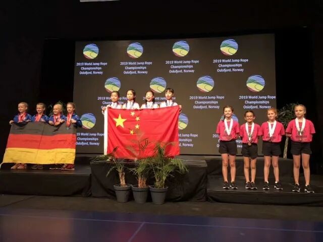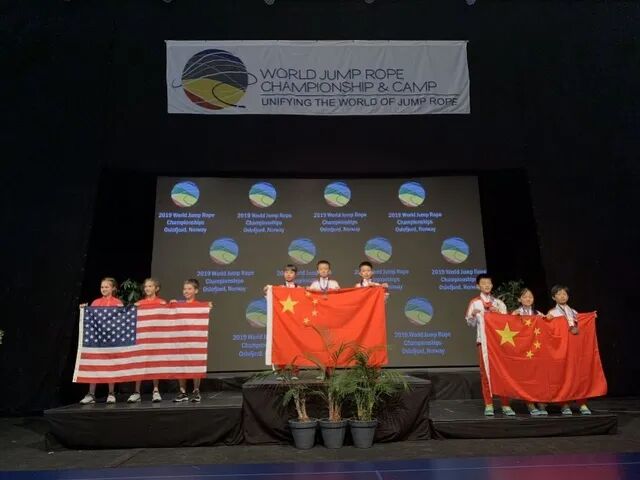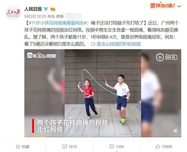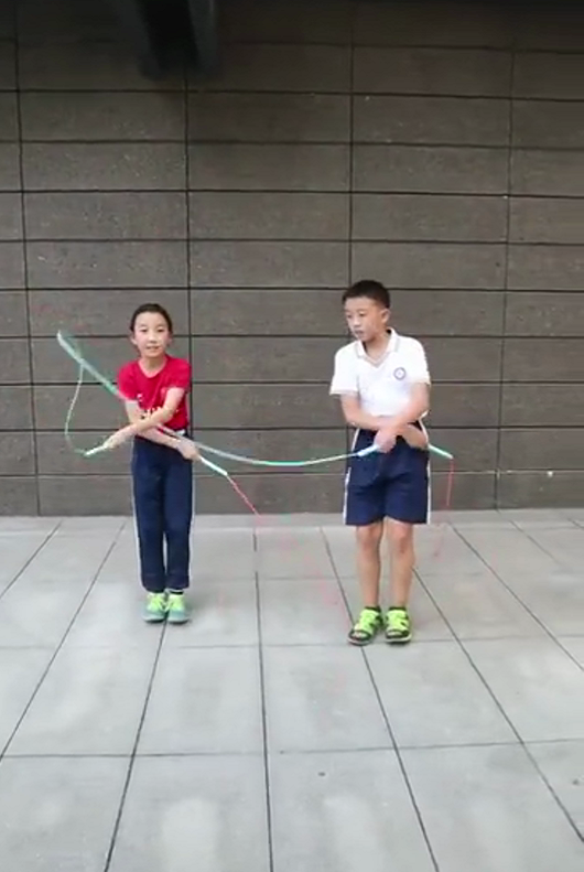 近日,“广州11岁小学生花样跳绳看晕网友”的视频走红网络。5月3日,南都记者了解到,视频中两名跳绳的同学仅有11岁,目前是广州市黄埔区东荟花园小学“云荟跳绳队”的队员,已进行四年专业跳绳训练。2018-2019年,两人多次在世界级跳绳比赛中获得冠军。南都记者从走红网络的跳绳视频中看到,两名同学同时挥动起两根跳绳,快速进行单跳、换边、转身、转圈等一系列高难度动作。伴随着欢快的音乐,两位同学身轻如燕,跳绳灵活地上下翻飞,看得人眼花缭乱。网友纷纷点赞称:“绳子还没打结,脑袋先打结了。”截至5月4日17时,这则20多秒的视频在抖音平台上已获得209.7万点赞,6.4万条评论。不少其他网络平台也对该视频进行转发传播。南都记者了解到,这段视频为广州跃动运动馆的花式跳绳教练兰兆林拍摄。兰兆林表示,4月29日,他带着多名跳绳队学员进行户外跳绳训练。训练结束后,他选中两名同学演示花样跳绳中的“车轮跳”,并录制视频打算作为后续参考资料。“他们跳得很棒,我就发在了自己的抖音账号上,结果就火起来了。”视频发布后,不少网友评论称“想让孩子学跳绳”。兰兆林向南都记者表示,要想达到视频中的熟练和默契,一般要训练至少三年以上。“首先要学会这种跳法,其次要花一定时间把动作掌握透彻。视频里两个学员能够流畅完成动作,也是因为他们有前期的基础沉淀和多年的配合。南都记者了解到,跳绳视频中女生叫彭乔乔,男生叫黄庆锋,目前是广州市黄埔区东荟花园小学“云荟跳绳队”的队员。两人今年只有11岁,不过已是有着多年跳绳训练的“专业级选手”。南都记者从云荟跳绳队主教练李晓宇处了解到,截至目前,彭乔乔、黄庆锋都已进行跳绳运动训练四年。2018年和2019年的跳绳世界杯比赛中,两人都曾参赛并斩获冠军奖项。2019年跳绳世界杯(挪威)女子4x30秒单摇接力冠军 (左一彭乔乔)。其中,2019年在挪威举行的跳绳世界杯比赛中,黄庆锋获得男子4x30秒单摇接力冠军、男子3x40秒交互绳速度接力冠军等9个奖项;彭乔乔也获得了女子4x30单摇接力冠军、女子2x60单摇接力冠军等“2金5银1铜”的好成绩。2019年跳绳世界杯(挪威)混合3人交互绳花样冠军 (中一黄庆锋)。视频走红后,来自网友的点赞让两名同学备受鼓舞。5月3日,彭乔乔妈妈告诉南都记者,彭乔乔从小学一年级起就被选拔进入学校跳绳队进行训练。小学二年级就开始参加世界级的跳绳比赛。“虽然以前她也拿过多次冠军,但这次网友点赞让小朋友觉得很受认可,感觉她对自己也更加自信了。”黄庆锋妈妈也向南都记者表示,没想到一段视频让儿子走红网络,“一分耕耘一分收获,小朋友们都很棒。也很感谢教练和老师们的培养。”据了解,疫情期间,包括两位同学在内的云荟跳绳队队员都坚持居家训练,并将训练视频发送给教练“检查”。“学会坚持,勇争第一是我们的口号。孩子们很努力,作为教练感到非常骄傲和欣慰。”李晓宇表示。