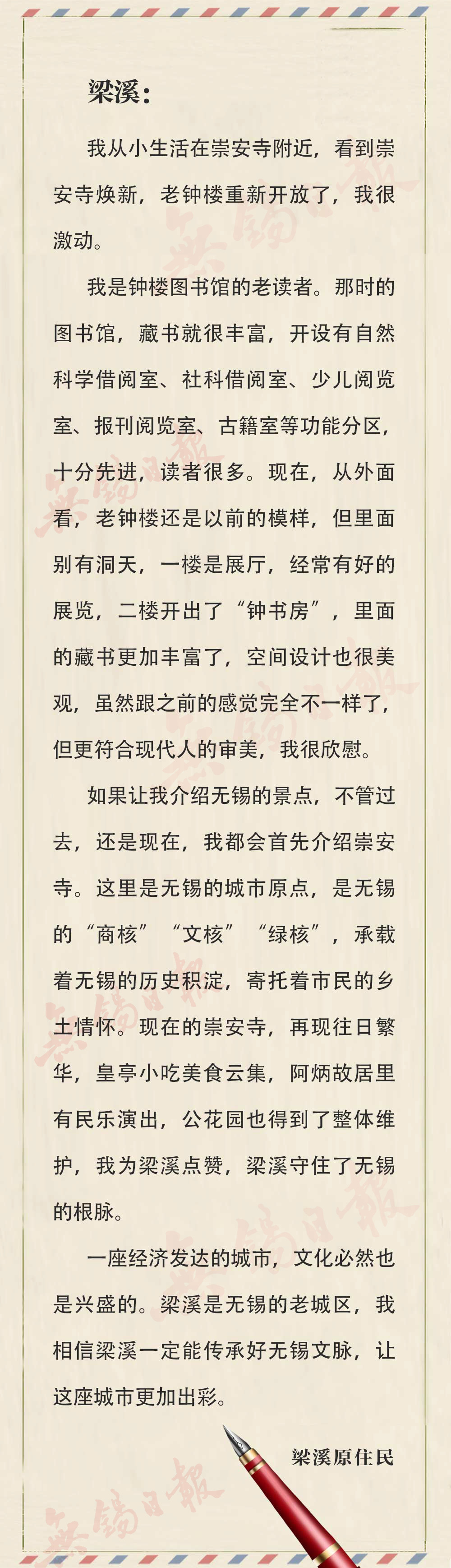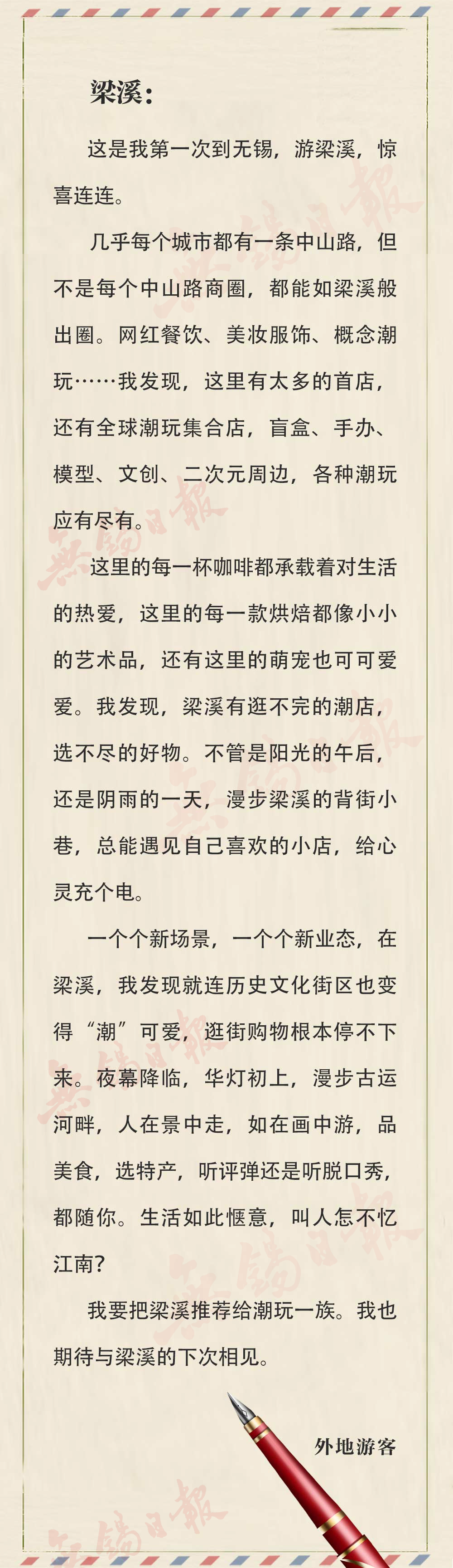 人与城,彼此依存 城市为人而建、因人而兴 人依城而居、与城共生 这是古老文明的土地 文脉绵延,社会昌明 这是培育产业的沃土 科技创新,活力涌动 这是时尚靓丽的热地 商贸繁荣,出圈出彩 这是宜居宜业的乐土 全龄友好,未来可期 于一个人而言,8岁正值龆年 于一个区而言,8年已成盛景 今天,在梁溪建区8周年之际 他们给无锡老城写下了一封封信件 老城也用实实在在的发展举措 回应着他们的期待 在他们的书信往来中 我们看到了 梁溪之强、之新、之盛、之潮 2023年,梁溪地区生产总值迈上1600亿元大关,社会消费品零售总额782亿元、总量保持全市第一,固定资产投资、工业投入、商品房销售面积、限上住宿业营业额、限上餐饮业营业额等指标增速位居全市前列。锚定未来产业,梁溪正加快构建人工智能、空天产业、机器人等十个产业生态圈,“数据、算力、算法”的人工智能应用领域稳步壮大,“梁溪号”卫星成功发射。 梁溪,两度登上赛迪百强榜:2023年8月,入围赛迪百强区,这是梁溪首次入围这一榜单;2023年12月,赛迪投资竞争力百强区发布,梁溪再度上榜,位次比上年晋升一位。在经济运行整体好转中,梁溪迈出了高质量发展的新步伐。去年以来,梁溪主动研判把握大势,积极顺应新趋势新要求,布局战略性新兴产业和未来产业,抢占前沿赛道,招引优质项目,打造十个产业生态圈,加快形成新质生产力。 今年,梁溪将加快实施科技企业、科创平台、科技人才倍增行动,基金招商、强链补链,力争落地50亿元以上重大产业项目3个、10亿元以上项目20个。今年,梁溪将在结构优化、产业布局上持续谋划,加快建设两大功能区,深入推进产业高质量发展实施意见,集聚更多资源要素,在十个产业生态圈上持续巩固和拓展优势。 梁溪坚守初心、用情用力,持续增进民生福祉。梁溪出台全龄友好城区建设三年行动方案,持续推动教育、卫生、养老事业高位均衡发展,东林小学课改项目获基础教育国家级教学成果一等奖、实现无锡大市“零突破”,国家基本公共卫生市级考核十连冠,儿童友好、青年发展、老年健康成为精彩城区的生动注脚。 新的一年,梁溪将继续坚持从群众最关心、最迫切、最现实的利益问题入手,聚力打造城市高品质生活。深入实施教育高质量发展三年行动计划,高位谋划学前教育、义务教育、高中教育,加快改造高密度学校,扎实推进集团化办学和教育数字化转型等工作。持续深化与市中医院“府院合作”,加快口腔医院国际化发展,推进区立医院、社区卫生服务中心、社区卫生服务站整体布局,真正满足群众就地就近就医需求。梁溪还将引入国企建设高品质康养中心,有机融合养老事业和养老产业。 围绕儿童友好、青年发展、老年健康,梁溪将全龄友好理念融入城市建设发展的各环节、各领域,同步导入社区商业、医疗服务等公共服务,构建“15分钟便民生活圈”,让中心城区既不缺商业繁华靓丽,又充满城市温情底色。 梁溪立足优势、传承文脉,深化文商体旅高度融合发展,全面焕新崇安寺、运河汇,加快开发建设惠山古镇,与央视合作拍摄《无锡国专》纪录片,精心组织“中华文脉·千年运河”首届大运河文化摄影展,老城厢活力魅力持续彰显。 新的一年,围绕城市核心区域,梁溪将一体推动老城更新、新城建设,提速推进三凤桥、南市桥巷、朝阳广场等核心地块工程,探索开发更多集住宿、办公、商业等功能于一体的复合型楼宇,在新城区域加快连片化建设,推动中央商务区、凤栖湾科创产业园、海峡两岸食品科技产业(无锡)合作试验区建设,让中心城区形象焕新、活力涌动。 以大运河文化带建设为抓手,梁溪将通过精心组织实施重大项目建设,有效串联旅游景区、商业街区和文创园区,打造精品旅游路线,实现资源整合、业态融合、市场复合。梁溪将深入实施“百宅百院”活化利用工程,招引入驻新型文化业态,打造一批“小而美”城市客厅,不断提升老城空间价值。 2023年,梁溪制定出台首店经济、夜间经济高质量发展三年行动计划,成功举办2023梁溪区首店经济发展大会,长三角首店经济发展城区联盟正式签约,顺利落地16个重点商贸服务业产业项目,累计入驻首店超过120家,位列全市第一,成功培育“今夜‘梁’宵”“西水夜巷”等16个夜间经济品牌和15个夜间经济集聚区。 新的一年,梁溪将聚焦扩大核心影响力、重塑商贸服务新优势。创新消费供给,拓展开放格局,提升载体品质。梁溪将围绕新消费新场景新业态新经济,引入专业团队和央企国企力量,加快盘活中心商务区闲置载体,依托恒隆、八佰伴等高端商业综合体,积极引育黑珍珠、米其林、无锡首店,做优做强首店经济、假日经济、夜间经济,奋力建设国际消费中心城市核心区和“购物天堂、美食之都”核心区。紧盯消费模式创新,梁溪将加快太湖广场现代服务业集聚区建设,更大力度培育直播电商经济,打造“国内、跨境、直播”电商发展新格局。 在这里 繁华深处有风雅 山水之间筑庭院 一街一巷 一河一城 这个年轻又古老的城区 邀请你,来赴一场“最江南”的繁花之约 如果你也有话 想对这个年轻而古老的城区说 不妨在评论区告诉小布! 素材来源:无锡日报 编辑:梁溪区融媒体中心 你的每一个“点赞”和“在看” 我都当成了喜欢![]()