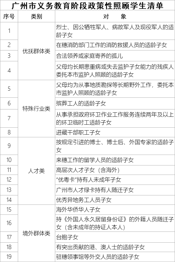 可以看看《广州市义务教育阶段政策性照顾学生清单》因为各区具体的政策会有所不一样,满足要求的家长可以去了解自己所在区的具体方式。