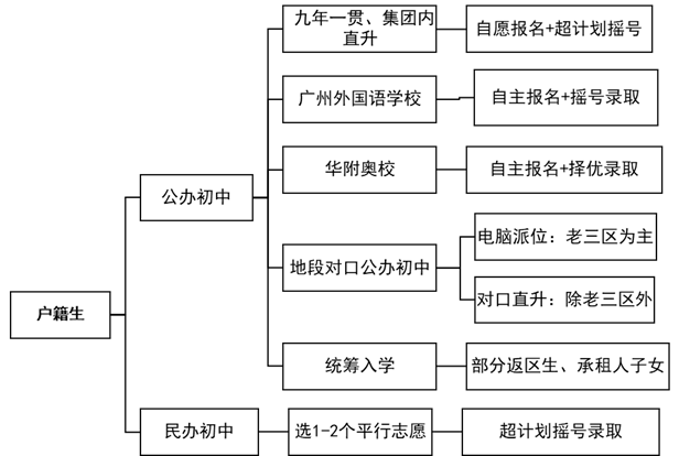 电脑派位,宛如一场借助现代科技力量举办的教育资源分配盛宴,依托电脑系统那精准而又神秘的随机摇号机制展开招生工作。在广州,老三区以及其他各区的特定地段或学校毅然采取了这种充满公平与机遇色彩的电脑派位方式。越秀、海珠、荔湾这老三区自不必说,作为广州教育的老牌核心区域,其教育资源的分配备受瞩目。而黄埔中心地带、番禺市桥区域、花都城区亦紧跟其后,纷纷引入电脑派位模式,力求在教育资源分配上达成更广泛的公平性与多元性。广州独特的派位模式呈现出多对多的精彩格局,即多个小学与多个中学相互对应。恰似一场盛大的教育配对舞会,究竟哪所小学的学子会与哪所中学携手共舞,全然由电脑摇号这双 “无形之手” 来巧妙裁定。以越秀区为例,这里常常会将 4 到 5 所小学精心编为一组,它们共同对口 8 所左右风格各异、水平有别的初中。这就意味着,学子们在这场摇号之旅中,既有可能幸运地踏入声名远扬的名校大门,开启一段充满荣耀与挑战的学习征程;也有可能被命运之轮摇向相对普通的学校。然而,无论去向何方,都不失为一次独特的教育成长机遇,在不同的教育土壤中都有可能绽放出绚烂的学业之花。通常而言,每年的 5 月,如同奏响了派位志愿填报的激昂序曲,家长与学子们需审慎思考、精心抉择,在众多的中学选项中挑选出心仪之选并完成志愿填报。而后,6 月则迎来了激动人心的高潮时刻 —— 电脑派位正式拉开大幕。在那一瞬间,电脑系统的快速运算与随机分配,将决定无数学子未来初中三年的学习归宿,也为广州小升初的舞台增添了一抹紧张刺激又充满期待的绚丽色彩。对口直升,就像是在教育版图中绘制出了一幅精准的升学地图。它以一所中学为核心坐标,精心划分出一个专属的升学片区。在这个片区里,那些如同繁星般散落的小学,以及返区等地段生,就像是被一条无形的升学纽带紧紧相连,能够直接升入这所中学,形成了一种别具一格的 “一对多” 模式,也就是一个中学如同一个引力中心,吸引着多个小学的学生向它汇聚。在广州的教育格局中,除了历史悠久、教育资源分配模式相对复杂的老三区之外,其他的区域(主要是繁华的天河、广袤的白云、富有小镇风情的番禺镇区、充满活力的花都镇区、蓬勃发展的增城、充满海洋气息的南沙以及自然风光秀丽的从化),基本上都把对口小学直升或者对口地段直升这种方式,当作学生升学的主要路径。这就好比在这些区域铺设了一条条清晰明确的升学高速公路,让学生们能够沿着这些路径,比较顺畅地驶向自己对应的中学,开启新的学习旅程。这种升学方式,不仅为学生和家长提供了相对稳定和可预期的升学方向,也使得这些区域的教育资源分配更加有序和高效。个别公办学校,是有自主招生(资源共享)名额的。他们有自己的招生方式和招生名额,拥有广州户口的家长,可以根据这些学校的要求,报读该学校。返区生:在A区读小学,想回户籍所在区B区就读公办初中。返穗生:广州户籍,但在除广州之外的城市就读小学,想回广州就读公办初中。每年5月会进行返区/返穗生手续的办理,具体留意教育局公布的文件。其是一所省属公办学校,能够在全省范围内进行招生,具有广东省户籍的学生都可以在网络上报名。生源90%的组成来源于广州,有极少部分来源于外市。广州唯一的市属外国语学校,坐落在南沙,需要具有广州户籍+广州学籍的学生可以自主报名。按往年招生录取时间,九年一贯制及集团直升为最早进行的招生,一般在5月份会提前报名。广州户籍的学生,以其户籍,或其小学毕业学籍界定属地区。户籍生家长可以依据户籍、学籍所在区,选定其中一个区进行填报志愿。2.若在九年一贯制民校就读,当被民办学校提前录取时,放弃民办也可参与公办摇号;若已错过公办注册时间,又放弃民办则会面临统筹,注意统筹的公办学位不一定是原来派位或者直升的学校。非户籍生也可以选择公办,但条件非常高,基本以就读民办学校为主,所以我们先讲讲就读民办的途径。