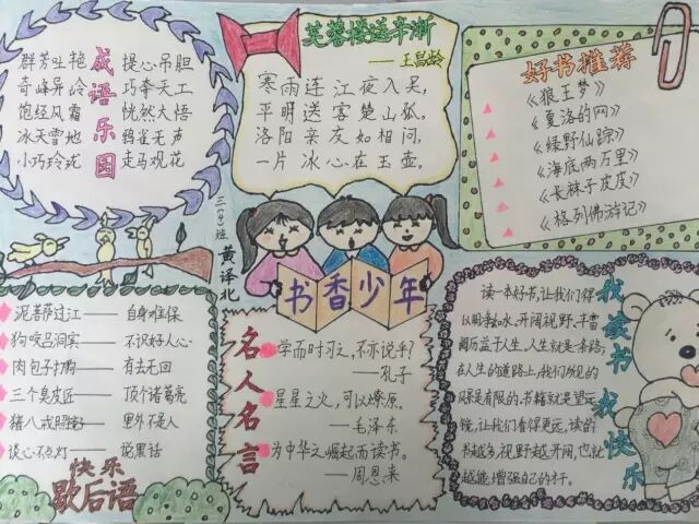 点击上方关注我们! 手抄报的形式很大程度上锻炼了学生的书写能力并丰富了想象力,提高了学生对学科的欣赏能力。下面是小编为大家带来的三年级语文手抄报图片及资料,希望大家喜欢。 三年级语文手抄报图片欣赏 关于读书的诗句 1、当怒读则喜,当病读则痊。恃此用为命,纵横堆满前。——杨循吉《题书橱》 2、读书有三到,谓心到,眼到,口到。——朱熹 3、人读等身书,如将兵十万。兵多行虑哗,书多语愁蔓。何以节宣之?一心制众乱。不见陆士衡,才富转为患。亦有淮阴侯,多多乃益办。要以我用书,勿为书所绊。——彭兆荪《读书》 4、书多笔渐重,睡少枕长新。——姚合《别贾岛》 5、己所不欲,勿施于人。——孔子 6、尹家在皋桥,喧阗井市区。何以掩市声,充楼古今书。左陈四五册,右倾三两壶。——文徵明《饮子畏小楼》 7、读书破万卷,下笔如有神。——杜甫 8、嗜书如嗜酒,知味乃笃好。——宋范成大《寄题王仲显读书楼》 9、知之者不如好之者,好之者不如乐之者。——孔子 10、书卷多情似故人,晨昏忧乐每相亲。眼前直下三千字,胸次全无一点尘。——于谦《观书》 学习语文的六步法 (1)了解。看课文、看注释、看课后的“思考与练习”,看单元知识和训练,了解了这些信息后,对单篇课文和整个单元就有了一个初步的印象和全面的了解。 (2)查相关的背景知识和扫除文字障碍。 (4)批注。就是在不懂的地方标上符号。如不懂之处用“?”,重点之处用“※”,课前自学批的字,最好用铅笔,听课后批的字可用钢笔写,以免时间一久,将自己的见解和老师的观点搞混了。 (5)质疑。就是对文章的见解、修辞手法、表达方法等提出疑问,这是成为一个批判型学习者的第一步,学生只有成为一个批判型学习者,才能起到事半功倍的学习效果。例如在《三国演义》、《水浒传》等古典小说中有许多将对将的单独拼杀,同学们就应该想一想这可能吗?如果不可能,作者又为什么这么写? (6)记录。就是做好读书笔记。 手抄报资料:我的妈妈 我的妈妈个子不是很高,留着长发,眼睛很有神,平时对人总是一脸笑容。妈妈对我非常严格,看见我没完成作业就在玩时,她的脸马上“由晴转阴”,我就得赶紧去写作业,看到我作业写的较好时,她都会夸我。 有一次,我放学回家,我没写作业就去玩电脑了。妈妈一回来,就问我做了作业了吗我说做了,又去玩电脑了。谁知妈妈让我把作业拿出来让她检查。我一时不知怎么样才好。妈妈见我的样,什么都明白了。把我叫到身边说:“儿子,你现在的主要任务是学习,先把作业完成再去做其它的。”我赶忙去做,马马虎虎地写一遍,又去玩电脑了。哪知妈妈悄悄地看了我的作业说:“你给我过来,重写!”我很不乐意,但妈妈还是要我重写。过了好一阵子,妈妈走过来一看,见我写的字比原来的好多了,高兴的说:“你认真起来,还是写得挺好的呀!”我听了心里特别高兴。 这就是我的妈妈,一个关心我、严格要求我的好妈妈! 生活中的语文作文 语文在生活中,也是调剂生活、陶冶情操的重要手段,生活中的语文作文。语文给人精神上的震撼是巨大的。一个人心浮气躁时,一篇优美的散文可以使他心如止水;一个人心情低落时,一篇慷慨激昂的文章可以使他重燃信心。语文带给生活的影响是无法比拟的。 生活处处有语文,生活中,你所说的每一句话都是出自“语文”这门功课,没有“语文”,你根本不能与别人交流,说出的每一句话都会成为笑柄。从小到老,我们也都在学语文,但却永远也学不完!就在我们的现实生活中,语文也无处不在。那么,生活与语文的联系到底在哪里呢?其实,语文就是语言文学,也就是文学的艺术。举个简单的例子来说吧,我们是学生,肯定就得听、说、读、写,那听说读写又是从哪来的呢?它们都是从语言那里来的,只是语文中的一部分。从此看来,语文有着很大的作用,说明了生活离不开语文的关键性。 书籍也是语文最直观的表现。俗话说:“读万卷书,行万里路”。可见没有书籍、没有语文的人类是不可进步的;没有书籍、没有语文的社会是不能发展的。同样,“书中自有黄金屋,书中自有颜如玉”,也证明从古代开始,人们就对书籍非常重视。没有书籍,我们无法体会梁山好汉的英雄气概;没有书籍,我们无法倾听林黛玉与贾宝玉的真挚爱情;没有书籍,我们无法了解诸葛亮的聪明睿智;没有书籍,我们无法见识孙悟空的无边本领;没有书籍,怎能体会更多的情感?没有书籍,怎能了解更多的知识?没有书籍与文字,人类怎能探究历史、展望未来? 语文在生活中,也是调剂生活、陶冶情操的重要手段。语文给人精神上的震撼是巨大的。一个人心浮气躁时,一篇优美的散文可以使他心如止水;一个人心情低落时,一篇慷慨激昂的文章可以使他重燃信心。语文带给生活的影响是无法比拟的。 语文也是许多可爱的小精灵,在人间自由自在地玩耍,东奔西跑,却无处不在;语文是生活的海洋,破涛汹涌,却浩瀚无边。 总之语文对我们的生活影响还很多。朋友,请你多用语文,从语文中,你会发现更多生活的乐趣,因为,我们活在语文的世界中。 推荐阅读 考考你!小学三年级下册英语综合练习题(附答案) 三年级语文:阅读和习作考试题型及方法,替孩子收藏一下! 三年级语文:“的、地、得”的用法口诀及小学语文词语搭配集锦 三年级数学思考题及答案,让孩子开动脑