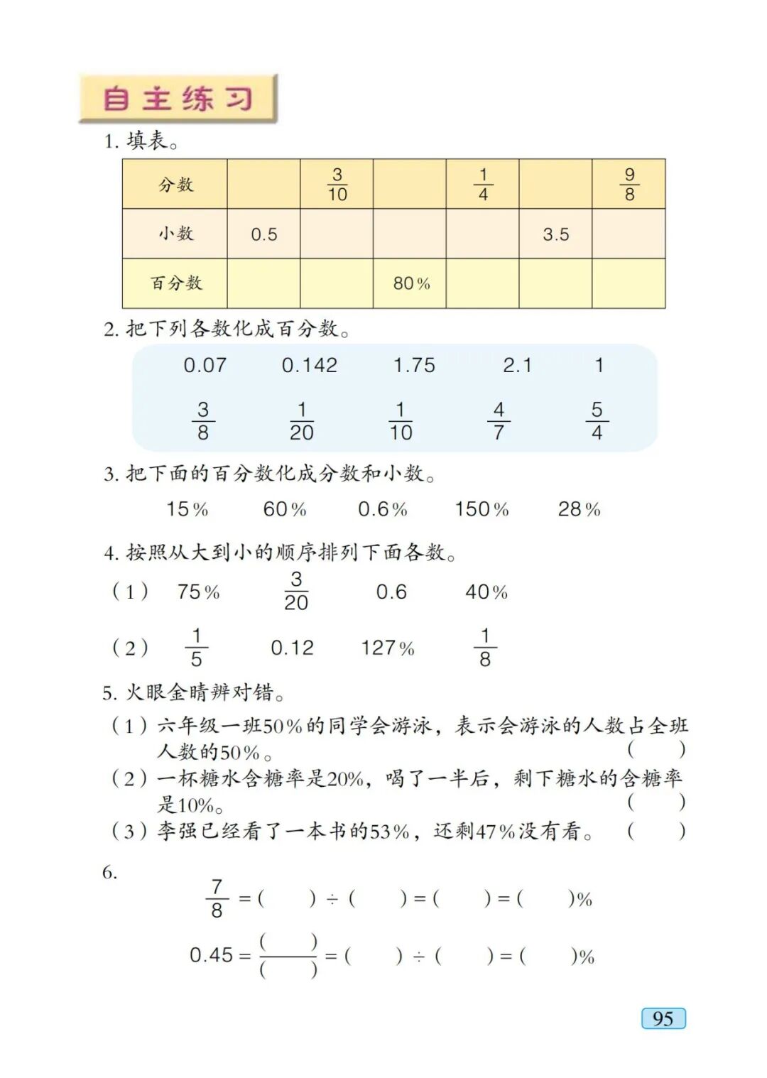 2、分数a/b化百分数:a÷b×100%
