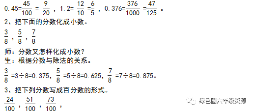 你所做的练习的各数是不是也发生了同样的变化?这一变化符合什么?(分数的基本性质。)(2)、百分数又怎样化成小数呢?根据上面的推导过程,小组讨论百分数化小数的方法。(先把百分数化成分母是100的分数,再化成小数。)
