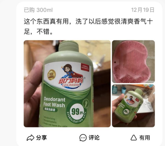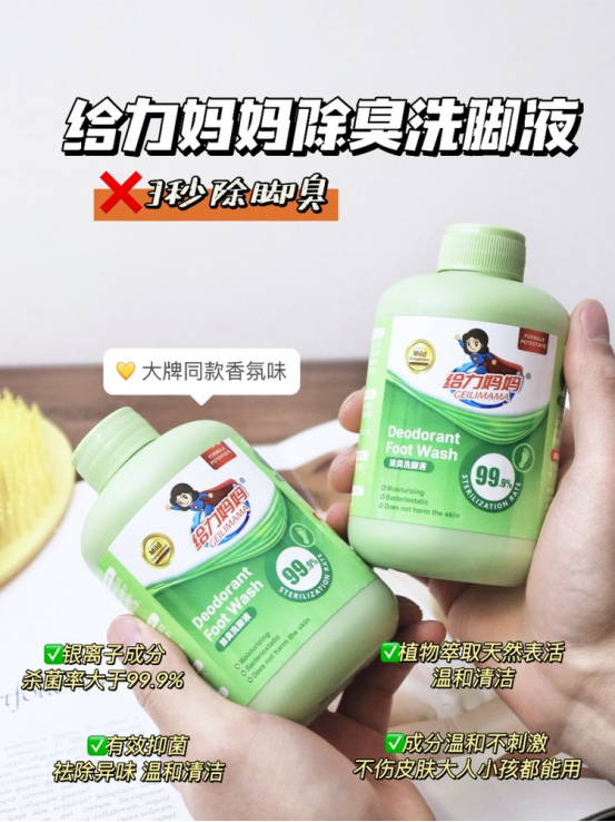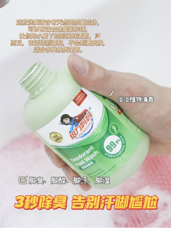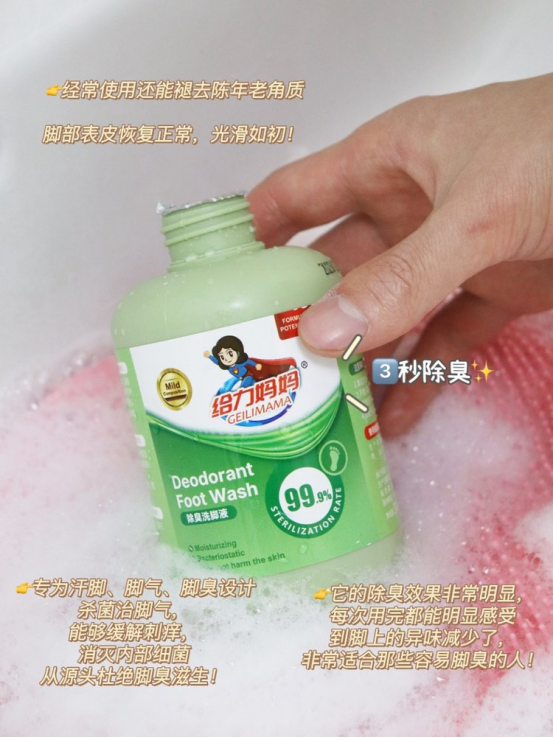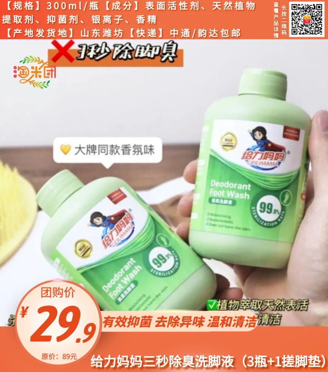 某宝1瓶89,开团福利价3瓶才29.9??还赠送一个搓脚垫日料店吃饭......每次脱鞋都是“大型社死现场”!不少孩子因为很多的原因造成了自己的脚臭,每次脱鞋时,那味道,那酸爽,真不敢领教。瘙痒难忍不说,上学还会被同学议论, 严重伤害孩子的自尊心。其实说到底脚臭都是细菌在作怪?? 脚部本就汗腺发达 长期被包裹在闷热空间里会助长各类细菌的繁殖 再加上鞋子不透气或材质不佳? 都会加速细菌快速繁殖导致脚气 通常细菌越多,脚越臭, 越容易发痒、脱皮、起水泡, 而单纯地洗脚无法解决问题??给我老公试用了几天后, 发现脚部的异味明显减少了,真的非常惊喜!??搅拌均匀后,将脚放入水中浸泡 15-20 分钟即可。