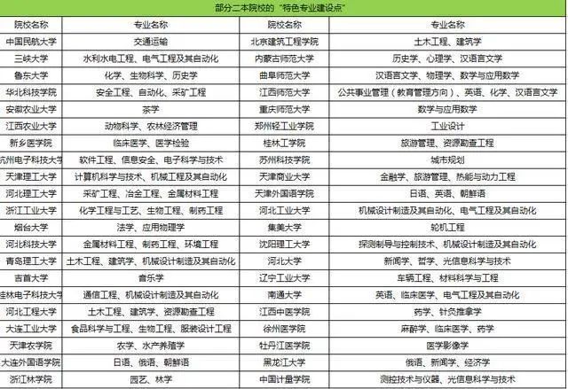 从上表可以发现,无论国字号的、省一级的、地一级的院校,都有自己的特色专业。这些专业有的是经营多年的老牌专业,有的是最近开发的 “朝阳专业”,还有不少是省部级重点学科或国家重点学科呢。可见这些专业含金量高、性价比高。按图索骥,瞄准这些二本专业填报,应该是物有所值,甚至物超所值吧。