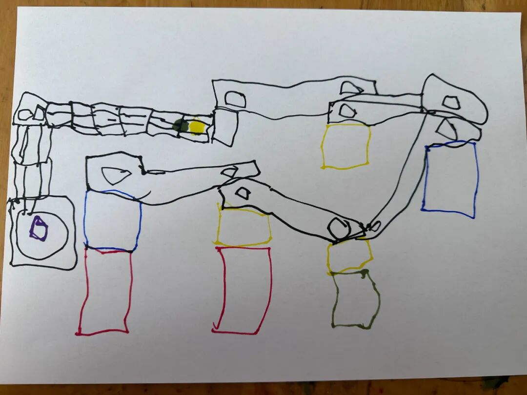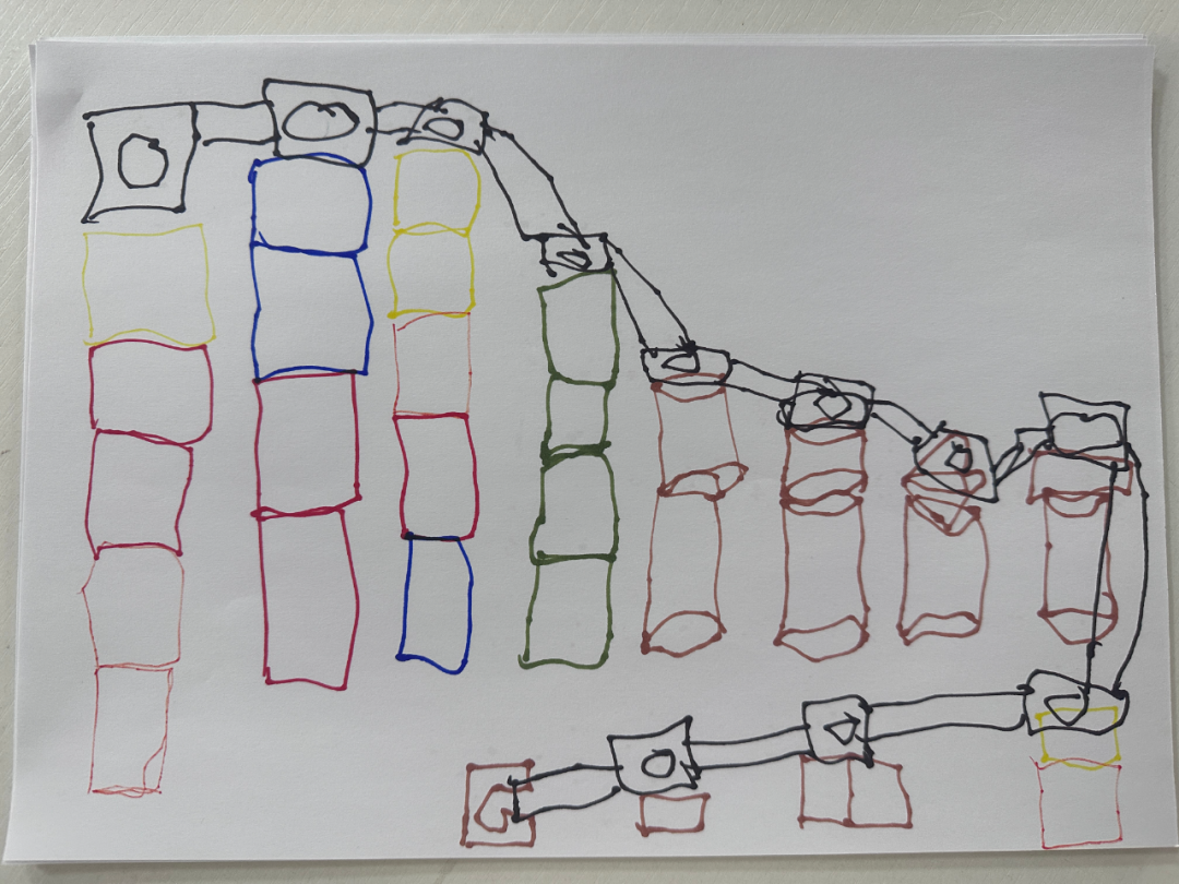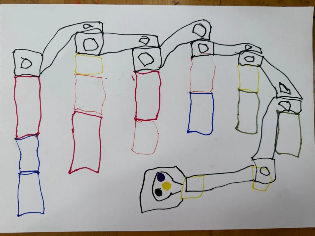 说完储一灿便开始了搭建轨道,储一灿一边拿积木搭建一边说:“这次我要搭建一个五层积木高的轨道。”说完,垒高起了五层积木(两根橘色长方体积木、两根红色长方体积木、黄色正方体积木。),旁边万艺欣摆上了四个积木垒高(两根橘色长方体积木、两根蓝色长方体积木。),摆到第五根柱子时,万艺欣说:“我们没有积木了,需要用建构区的积木块了。”说完拿出两块长方形积木块靠在一起,垒高了三层,储一灿则拿出两个长方柱积木靠在一起当轨道支撑柱,接着一层一层搭建了起来,在搭建到第8根支撑柱时,第6、7处的支撑柱突然倒了下来,储一灿看了看说:“这两根柱子好像不太稳,我们再加两根吧。”说完把两个长方柱积木换成了四个长方柱积木,然后继续搭建。