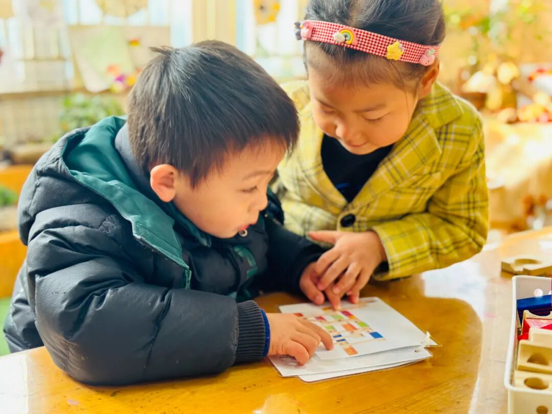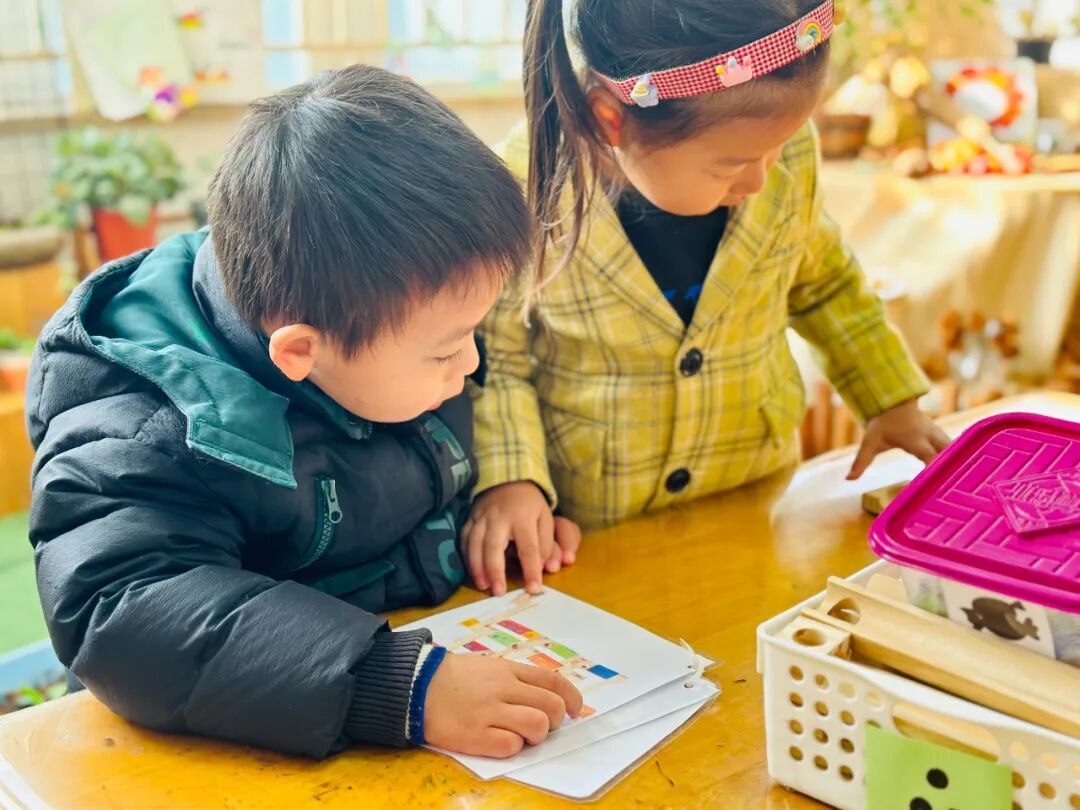 2.观察幼儿是否能按照想法进行轨道搭建,搭建出重心稳的轨道。万艺欣和储一灿端好材料,坐下来之后,万艺欣拿出指示卡和储一灿两个人一起讨论搭建什么样的轨道,万艺欣指着指示卡上的轨道说:“储一灿,我们来搭建这个轨道吧?”储一灿摇摇头说:“这个轨道,我都搭过了,今天我们自己来搭轨道吧,我们不要搭和这个上面一样的。”万艺欣把指示卡放到一边,看着储一灿说:“好吧,那我们自己来搭建吧。”