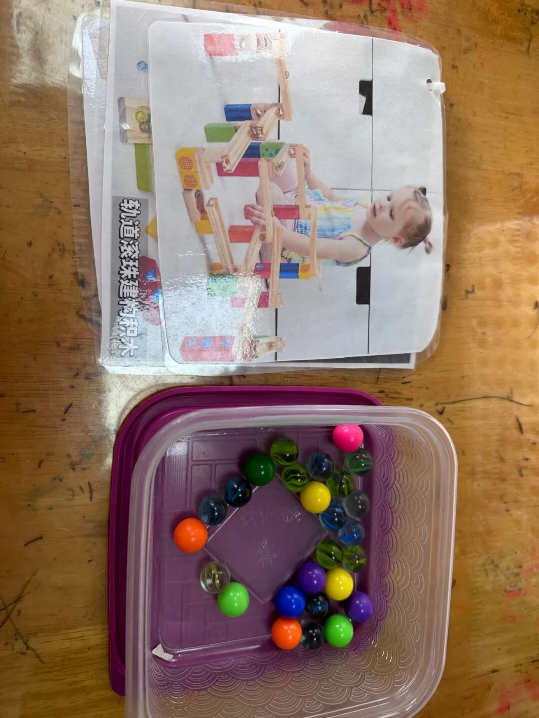 轨道搭建成功之后,储一灿拿出一颗紫色的小球放入轨道滚动,储一灿和吴熳灵盯着小球顺利滚到终点,吴熳灵拍着双手说:“耶,我们成功啦。”储一灿也在一旁比划着耶的造型,吴熳灵走到储一灿旁边说:“我也来试试。”说着拿起黄色的小球放进轨道,储一灿拿着绿色的小球,跟在吴熳灵后面。我今天和吴熳灵一起搭建了轨道,这次我们搭建的是高高的轨道,没有在桌面上平平的铺一层轨道,我们从最顶端放进的小球,每一个小球都进入终点了,我们成功啦。 ——储一灿1.区域游戏一开始,吴熳灵和储一灿争抢同一样材料游戏时,储一灿小朋友能友好地提出一起合作游戏的请求,吴熳灵也愿意和储一灿一起游戏,能与同伴友好相处,没有发生争抢事件。2.在游戏过程中吴熳灵碰倒了刚搭建的轨道,储一灿没有发脾气,而是选择让吴熳灵帮助自己扶住轨道,自己则按照一开始两人约定好的想法进行搭建。储一灿:我和吴熳灵今天搭建了一个高高的轨道,每一个小球都滚进终点了,我们成功了。