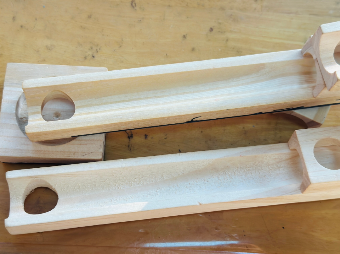 搭建完成之后,储一灿和万艺欣便拿出小滚珠测试轨道是否顺畅,发现小球每到轨道连接口处就会卡住。万艺欣上前查看长方形轨道口是否对准,手一移动轨道,哗啦一下,轨道倒了。万艺欣和储一灿对视了两三秒钟,万艺欣笑着说:“哎呀,又要重新搭了。”储一灿看了看桌上的积木对万艺欣说:“我们试试看用这个卷纸芯桶搭建轨道吧,这个积木总是一碰就倒。”说完,储一灿和万艺欣俩人一起把积木块和长条形积木换成了卷纸芯桶。然后万艺欣拿出一颗粉色的珠子测试轨道是否顺畅,这次小珠子一路顺畅的滚下,到最后一格轨道时,又停住了,储一灿上前查看,伸出手指摸了摸轨道说:“这个轨道毛毛的,换一个光滑的轨道吧。”说完到材料框里拿出一个轨道换了上去,然后万艺欣拿出小珠子,开始测试,第一颗珠子顺利滚进了终点,万艺欣又拿出一颗珠子测试,顺着第二颗珠子也滚进了终点,储一灿和万艺欣一边拍手一边说着:“耶,我们成功啦。”
