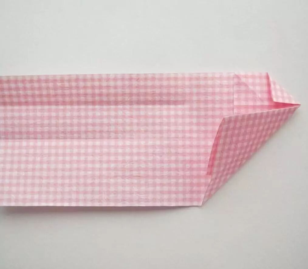 把中间长条部分向上折,下部的斜折痕对其中线压平。