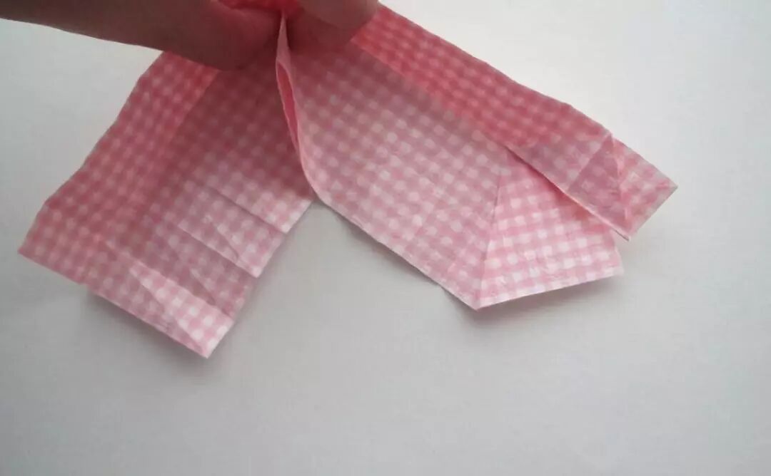 将上部向上拉,下部两边沿折痕...