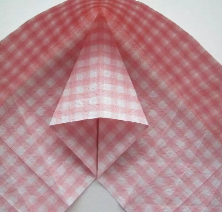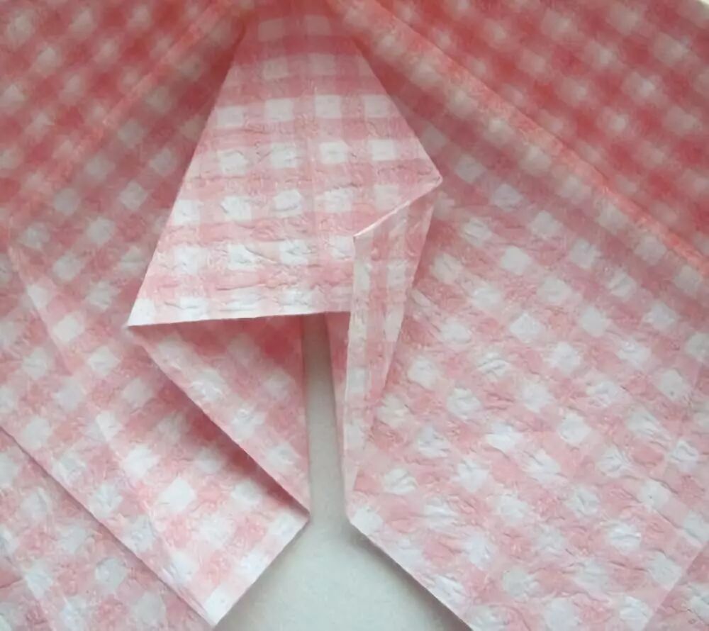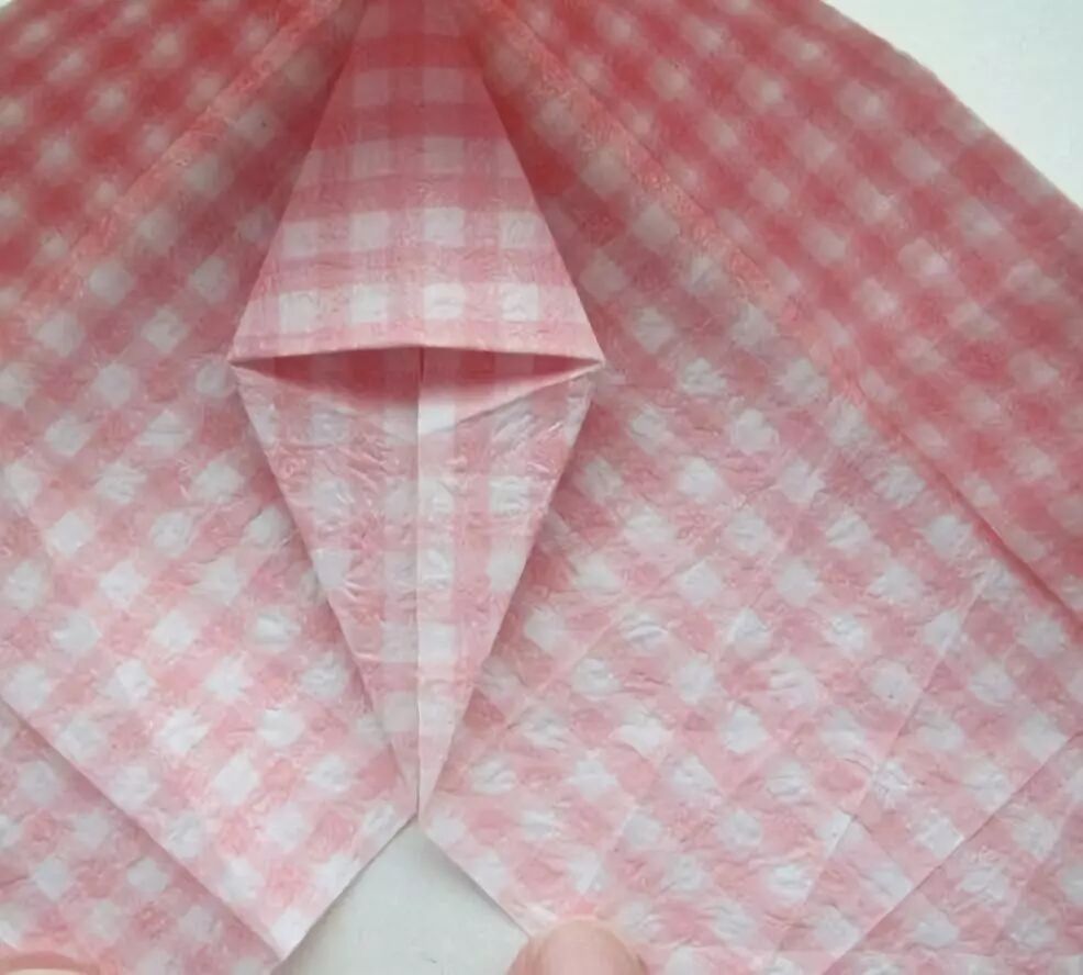 将菱形打开,上方的小三角压入内侧,形成一个三角小袋。