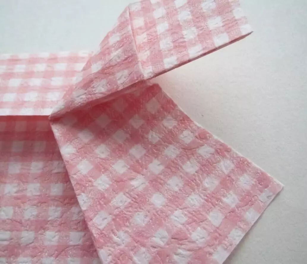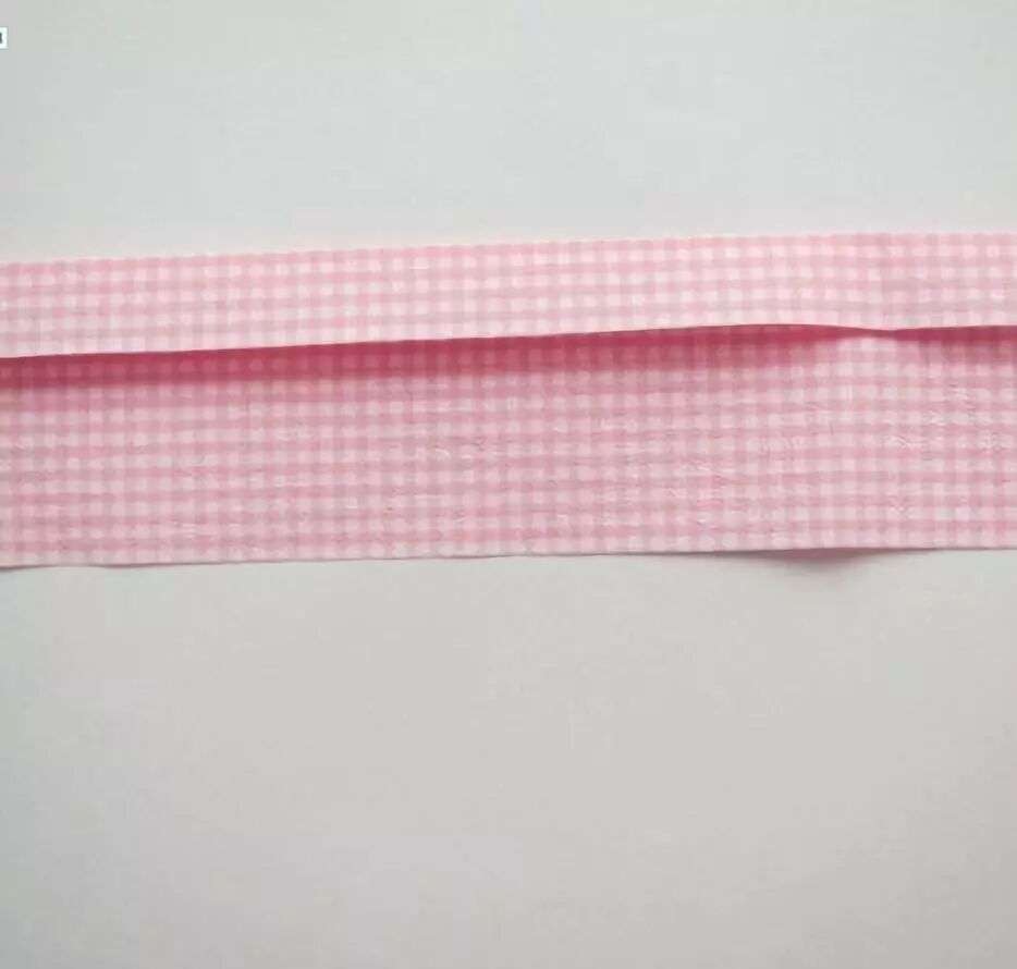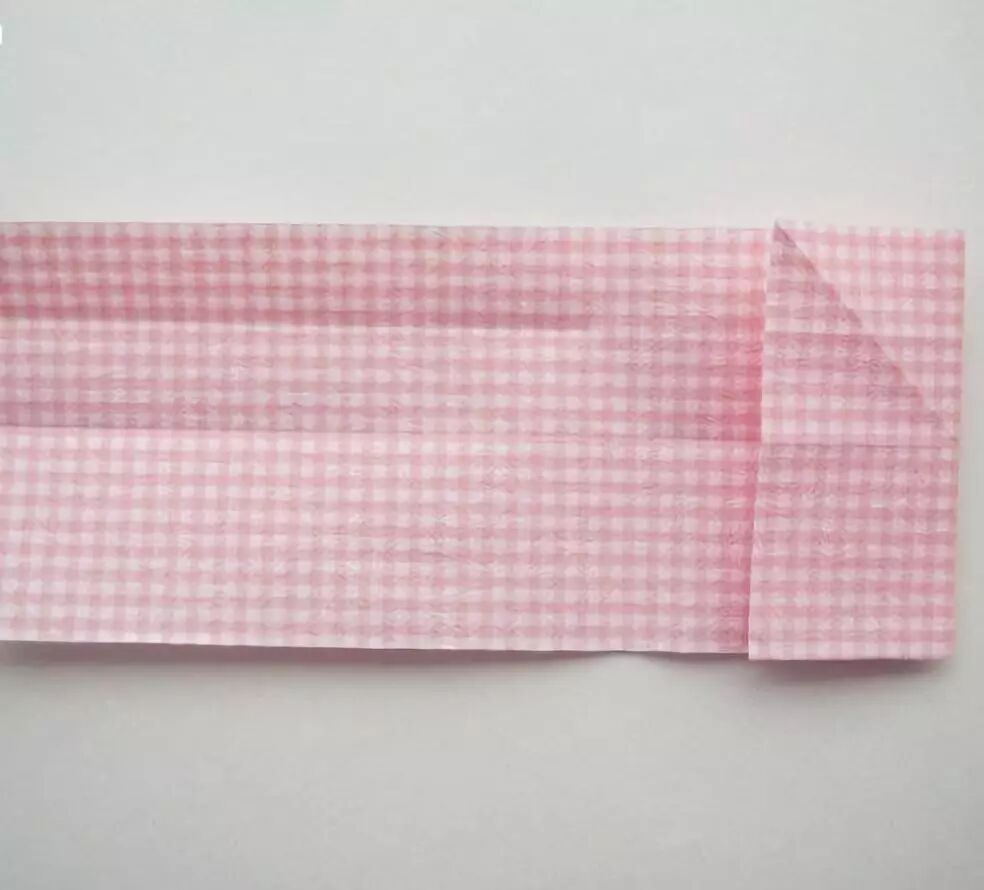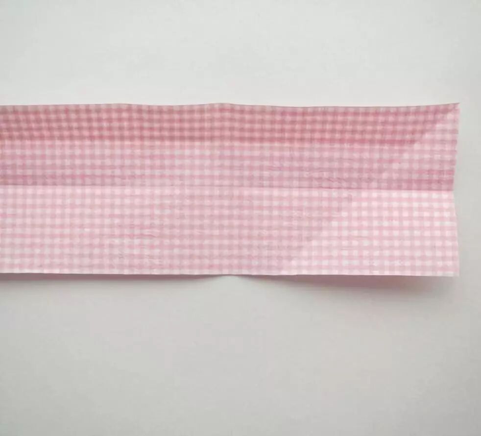 将长方形长边对折自己,如果有花面,花面朝下。长方形上下对折