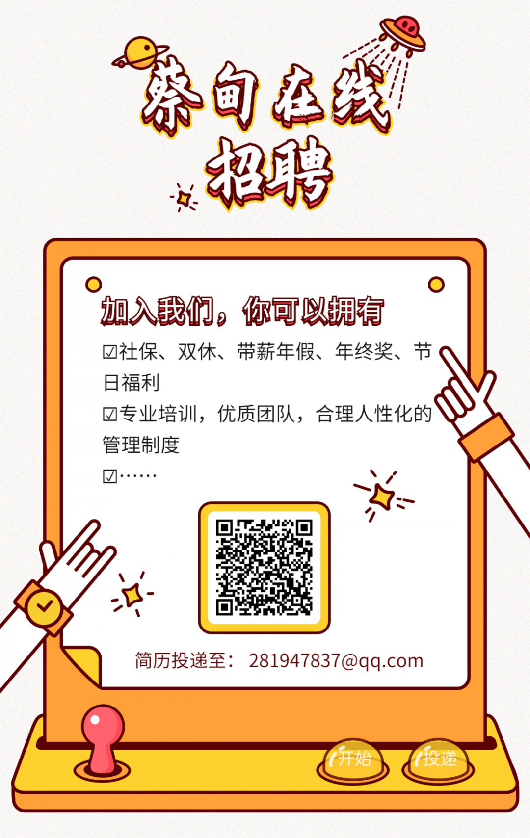 「投递简历看这里」 如果你想加入蔡甸在线 请把你的作品、以及你之前牛逼的经历 制作成一份简历 发送到邮箱:281947837@qq.com 或添加下方微信咨询 添加请备注:姓名+应聘岗位 如果你找工作 请抓紧时间投递简历 主动一点,我们会有故事 如果你身边有人求职 请将这则招聘信息告诉TA 赠人玫瑰,手留余香 答应蔡小编,扩散周知