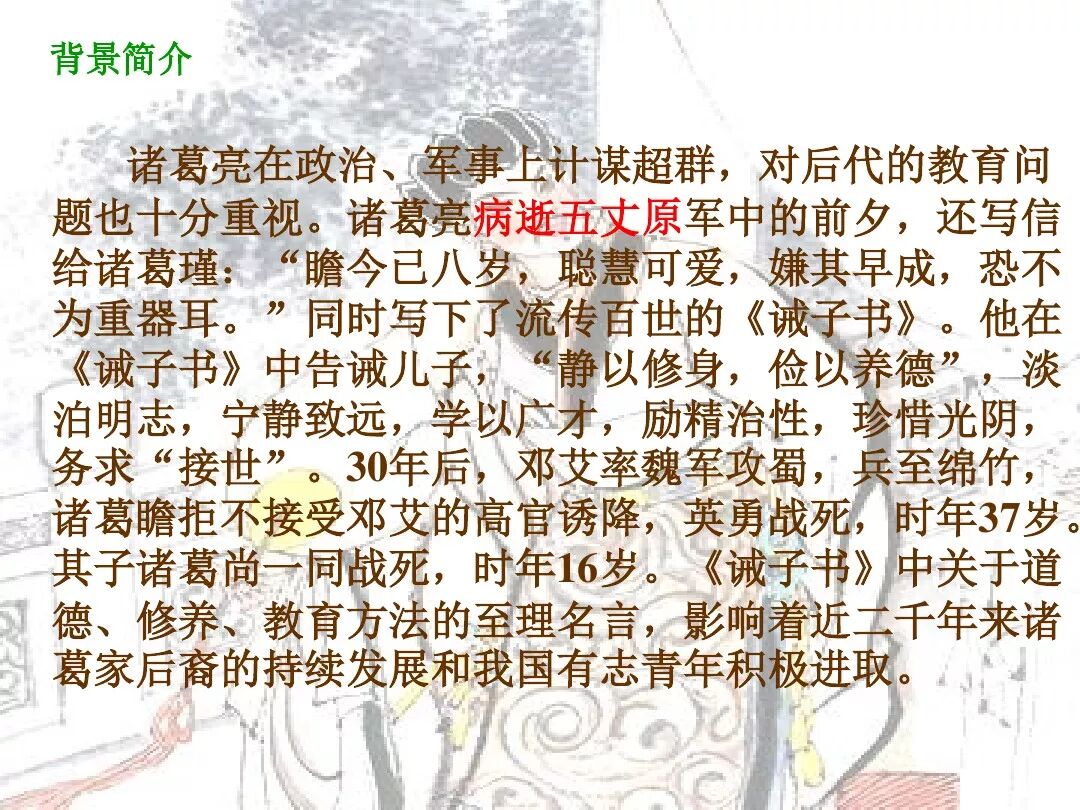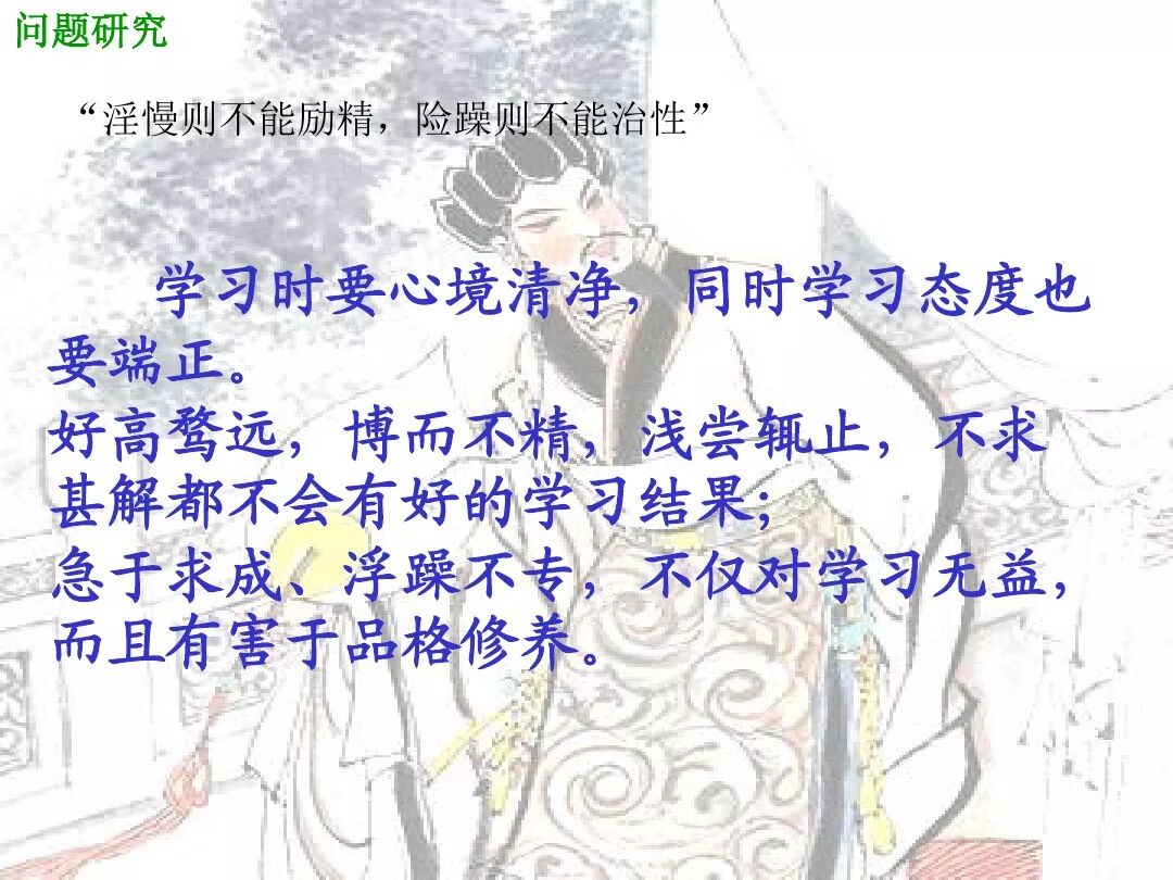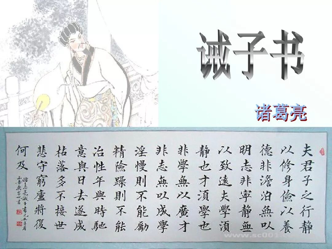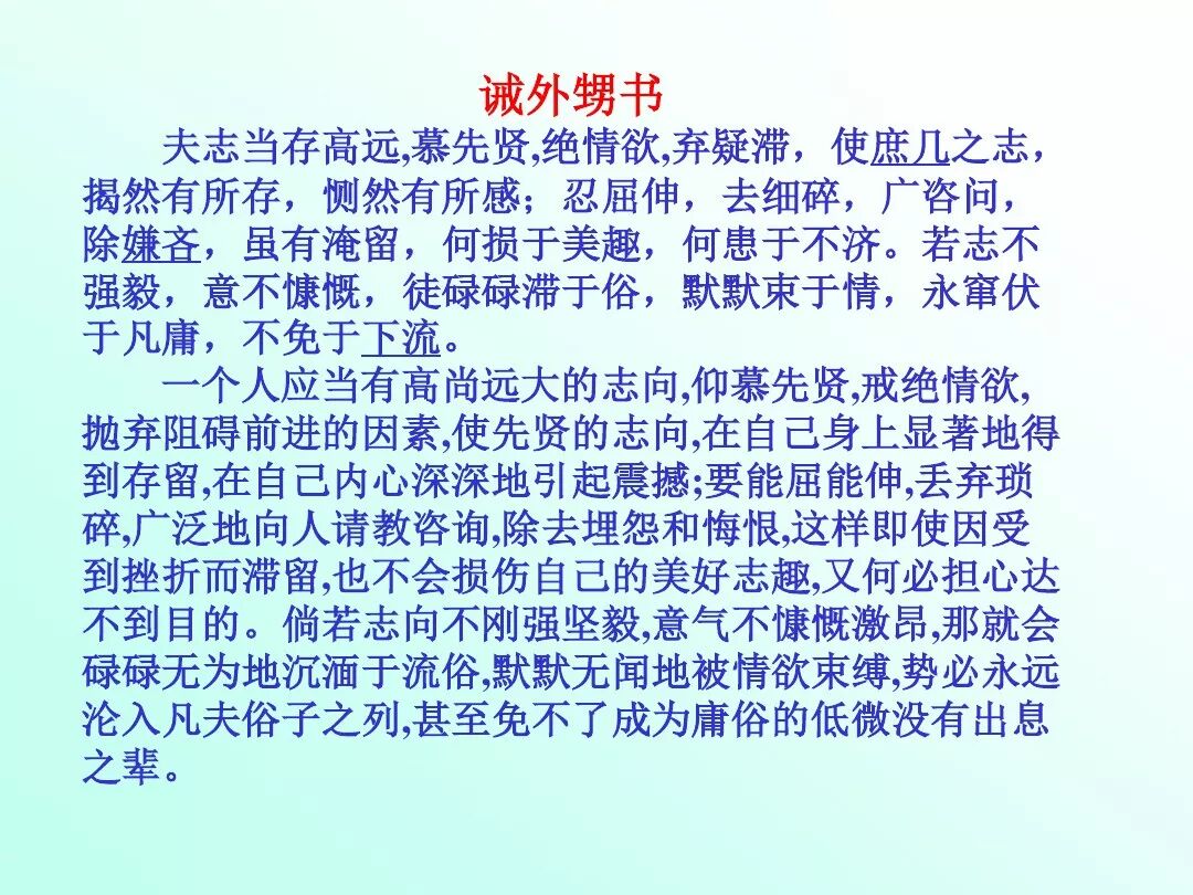 【小结】:本文以父亲的身份告诫儿子读书修身,勤学励志、静心养德,要从“澹泊”“宁静”中下功夫,最忌“淫慢”“险躁”。