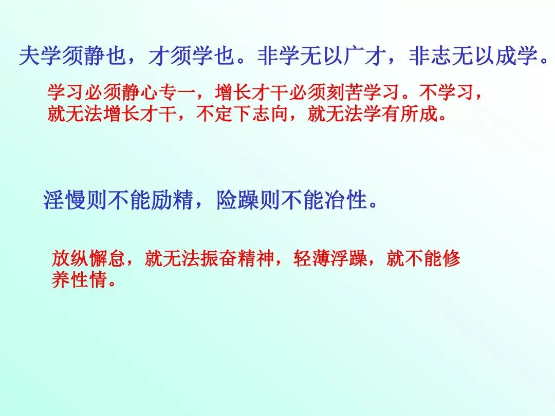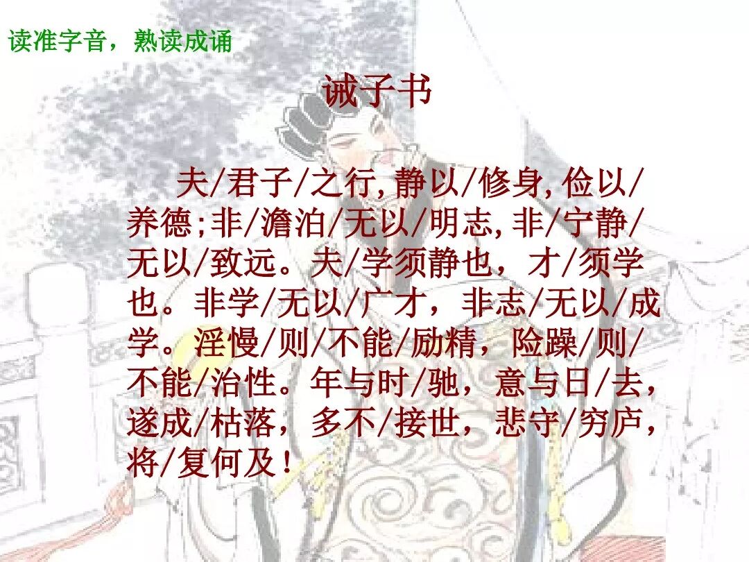 【原文】:夫/君子/之行,静/以修身,俭/以养德。非澹(dàn)泊/无以/明志,非宁静/无以/致远。夫/学/须静也,才/须学也。非学/无以/广才,非志/无以/成学。淫慢/则不能/励精,险躁/则不能/治性。年/与时驰,意/与日去,遂/成枯落,多/不接世,悲守/穷庐,将/复何及?