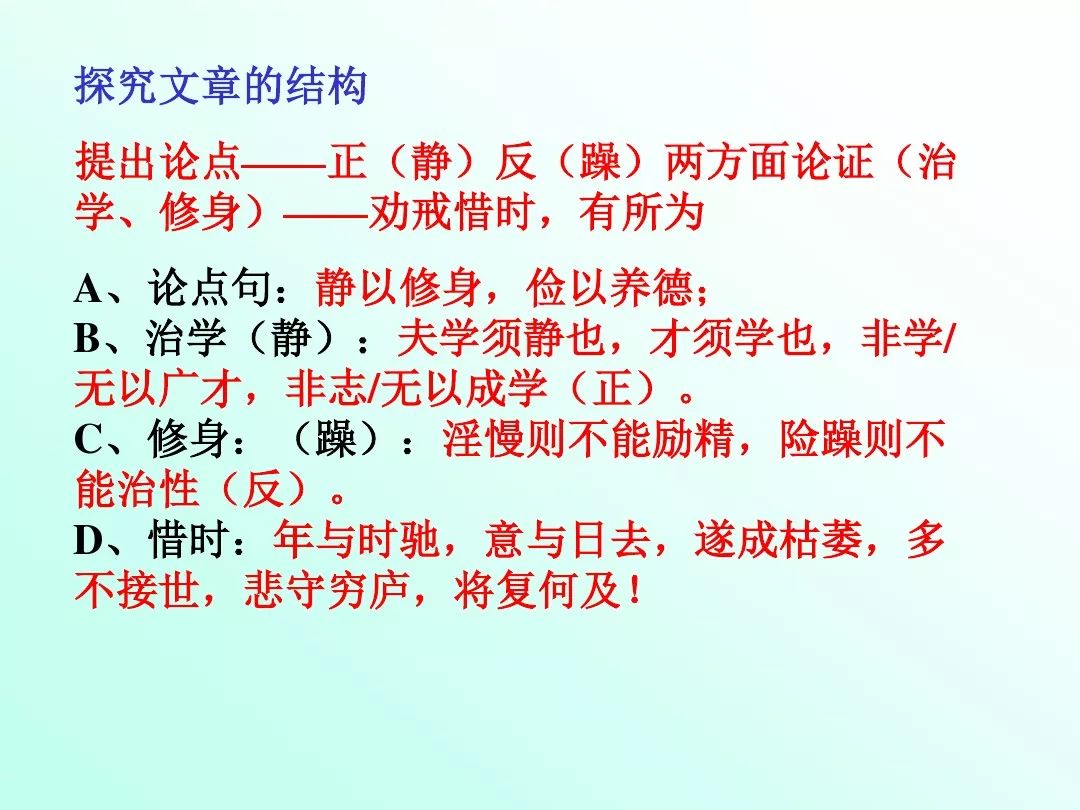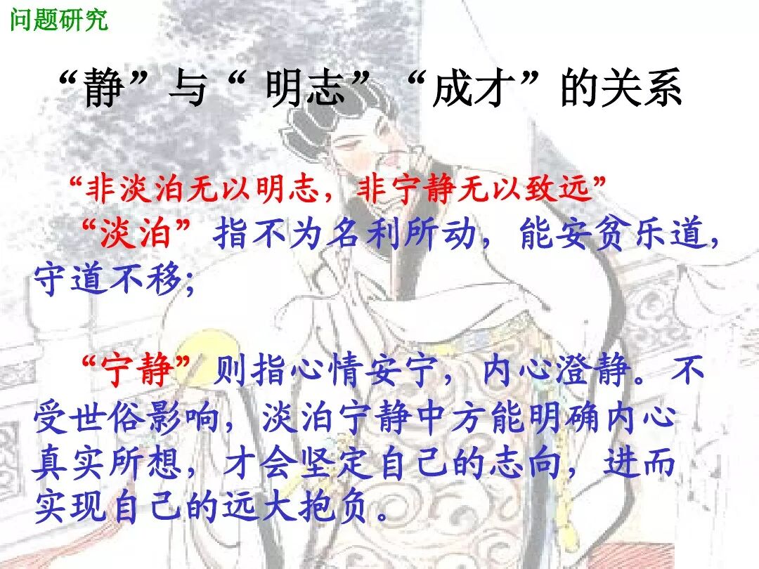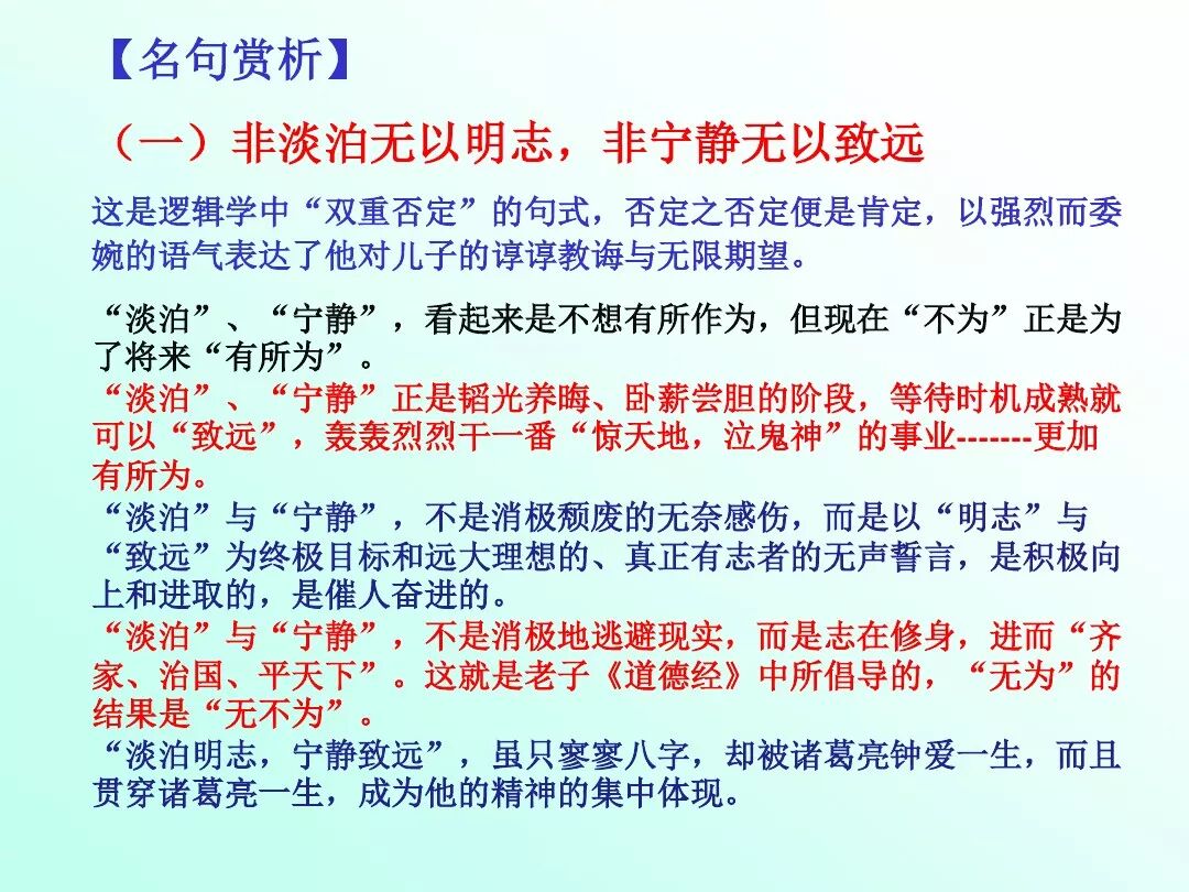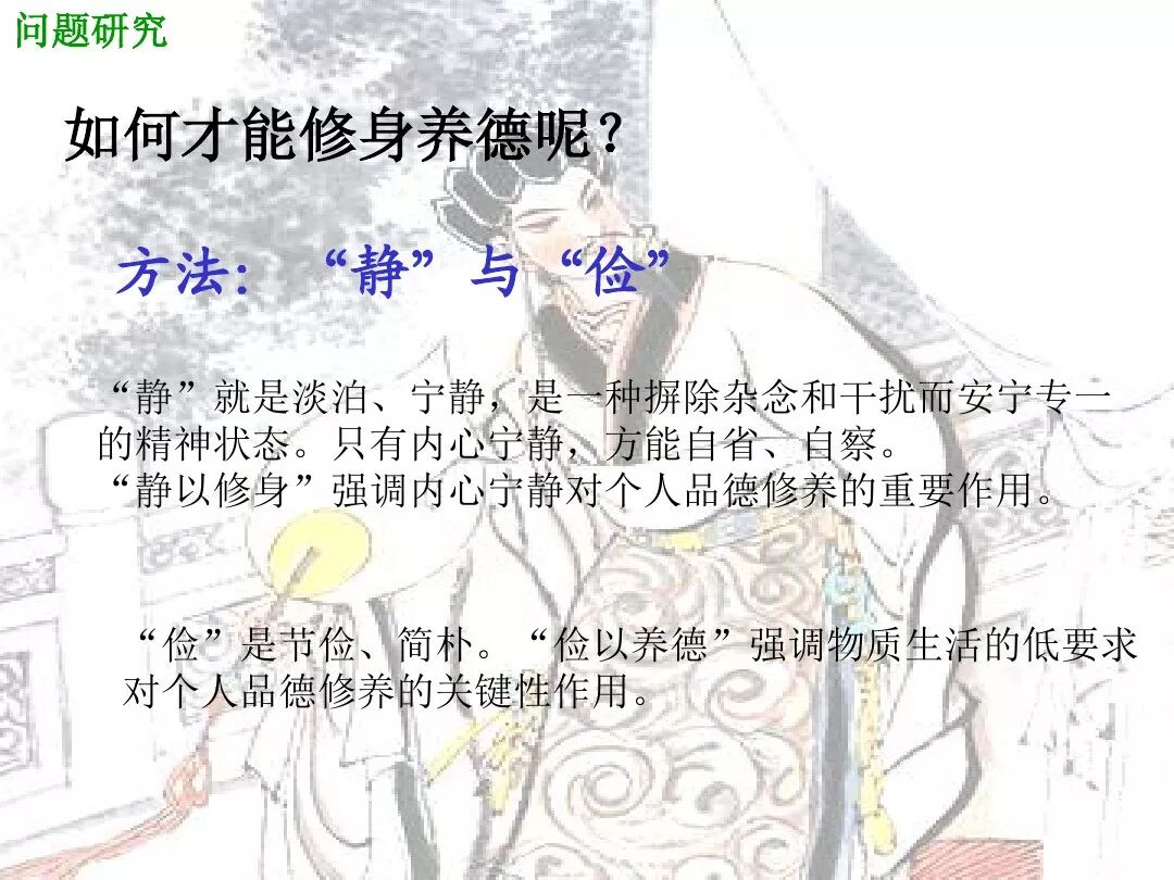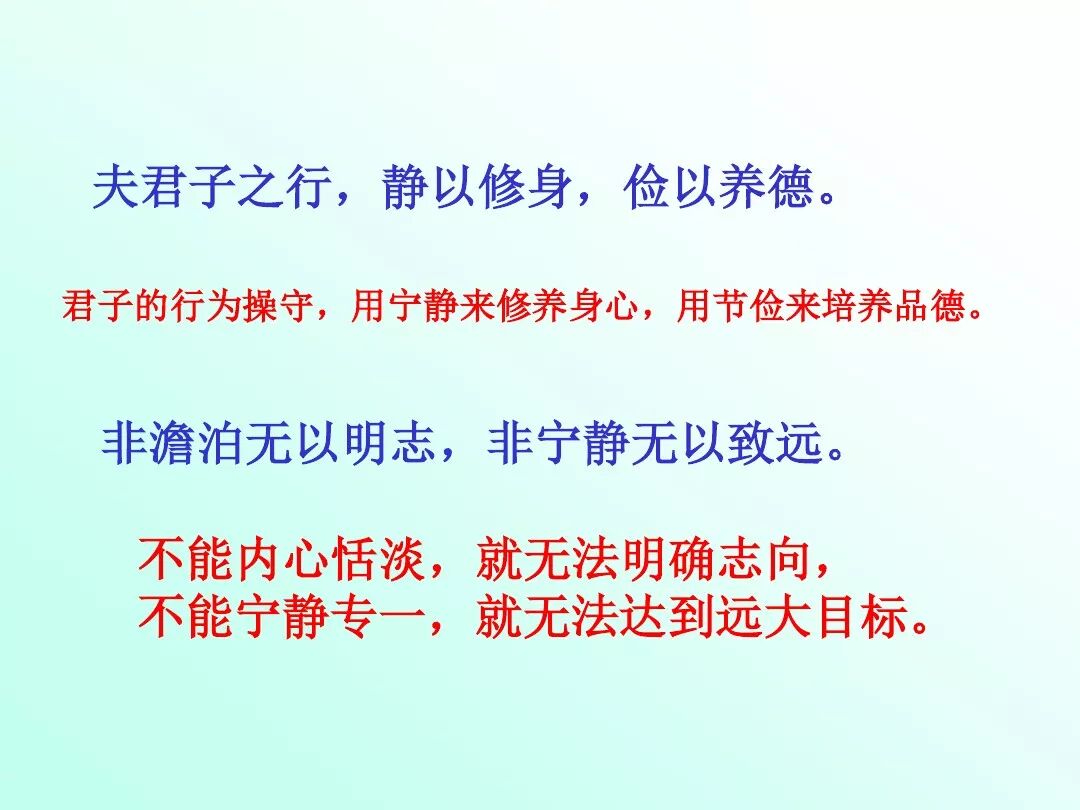 (1)开篇以“君子之行”的高标准道德规范要求儿子,明确提出修身养德的要求和具体途径。“静以修身”强调内心宁静对个人品德修养的重要作用,“俭以养德”强调物质生活的低要求对个人品德修养的关键作用。