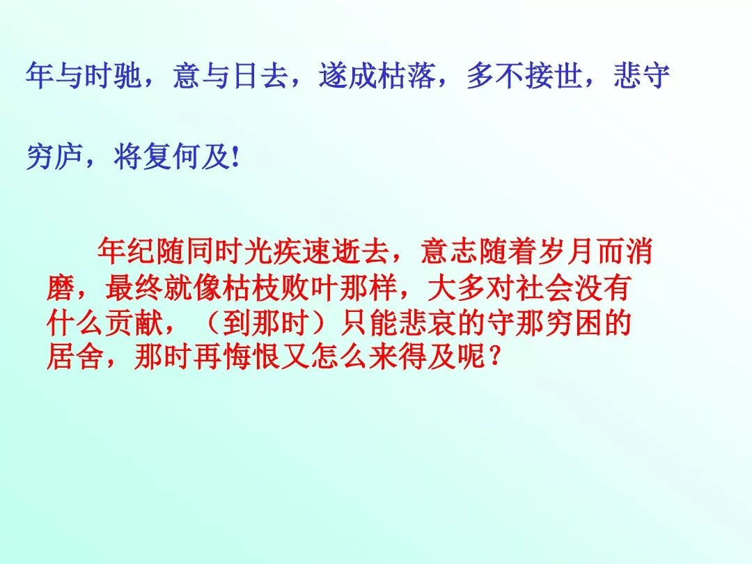 (2)人在少年时期就应该树立远大的志向,发愤图强,因为时光飞逝,意志力也会随着时间消磨,少年不努力,就会一事无成。