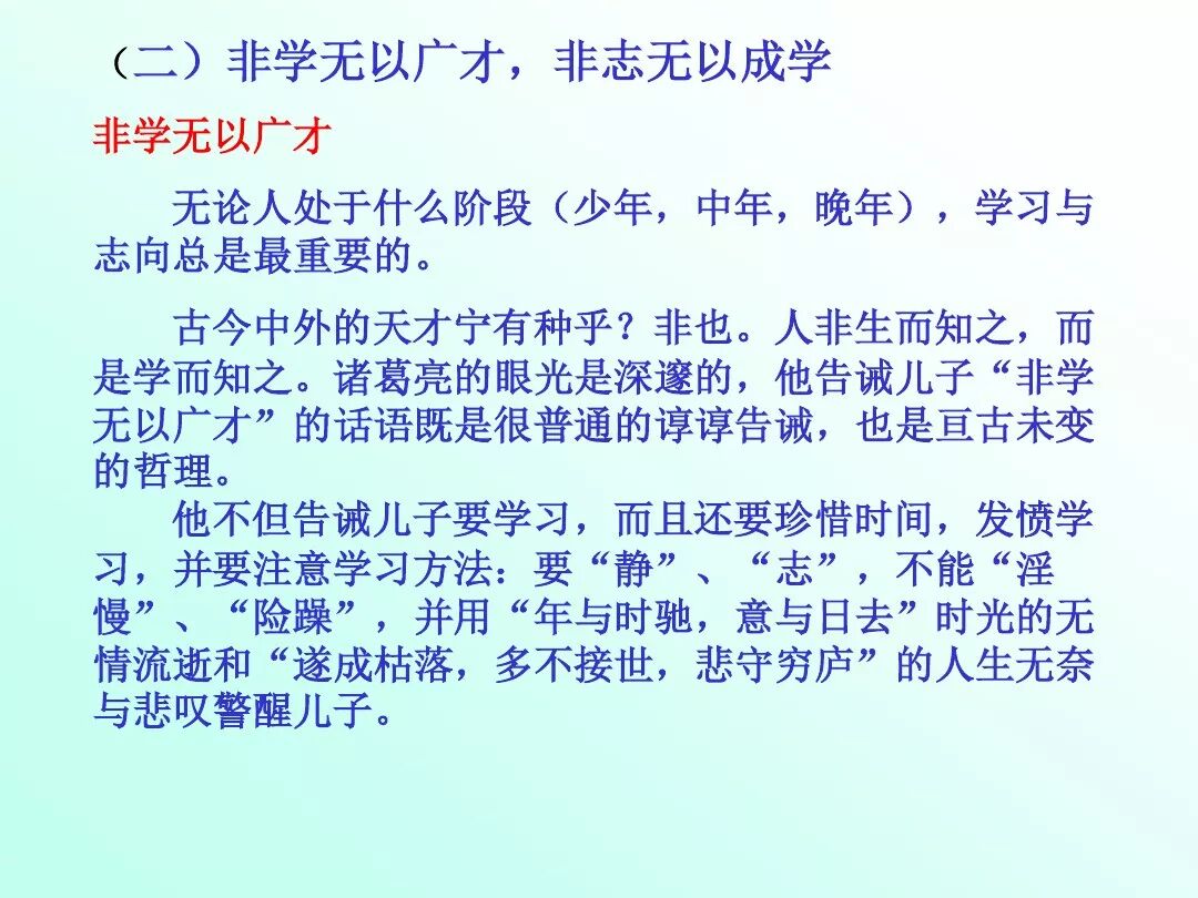 (2)“非学无以广才,非志无以成学”:作者将立志、学习、成才三者紧密联系,告诫儿子要志存高远,勤学成才。