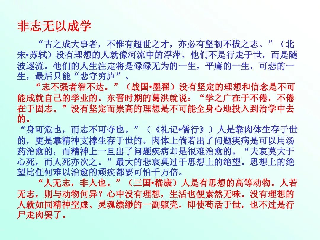 参考答案:“非淡泊无以明志,非宁静无以致远。”“非志无以成学。”文中强调“志”的重要性:一方面要靠淡泊、宁静以明志,即时时将“志”放在眼前,不断磨砺;一方面强调无“志”则不足以“成学”,没有志向则学无目标。