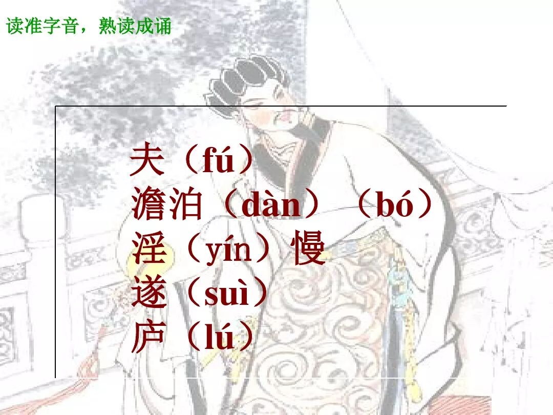 【重点字解释】:诫:告诫、劝勉、警告,劝人警惕。书:书信。诫子书:即作者诸葛亮写给儿子旨在劝诫、劝导的信。夫(fú):段首或句首发语词,引出下文的议论,无实在的意义。君子:品德高尚的人。修身:提高自身的修养。养德:培养高尚的品德。澹(dàn)泊:也写“淡泊”,不追求名利。致远:实现远大目标。明志:表明自己崇高的志向。宁静:指安静,集中精神,不分散精力。致远:实现远大目标。须:必要、一定要。广:使……增广。才:才干。广才:增长才干。成:达成,成就,使……完成。淫慢:过度懈怠。淫:过度。慢:懈怠,懒惰。励精:振奋精神。险躁:偏激浮躁,与上文“宁静”相对而言。治性:陶冶性情、养成平静的性格。年:年龄。与:跟随。时:季节、时光。驰:疾行、增长。日:时间、时光、季节。意:意志。去:离开、消逝、逝去。遂:于是,就。枯落:枯枝和落叶,比喻人精力衰竭,失去生活力。多不接世:意思是对社会没有任何贡献。接世:与外界接触,融入社会。穷庐:破房子、偏僻简陋的房屋。将复何及:(后悔)又怎么来得及呢?