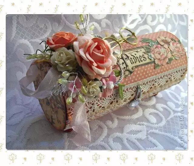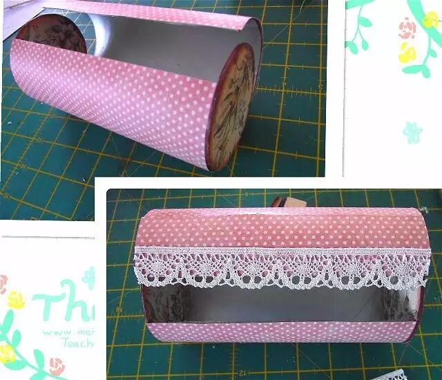 用卡纸做两个圆形粘贴在薯片筒两边,再用彩色纸、蕾丝花边和小花儿装饰好就完成啦~