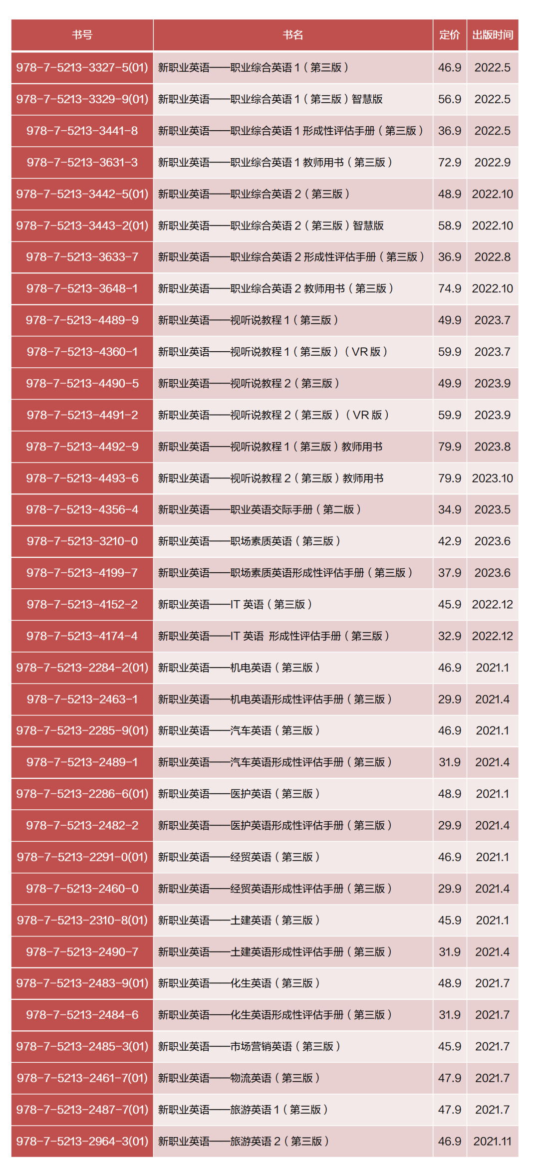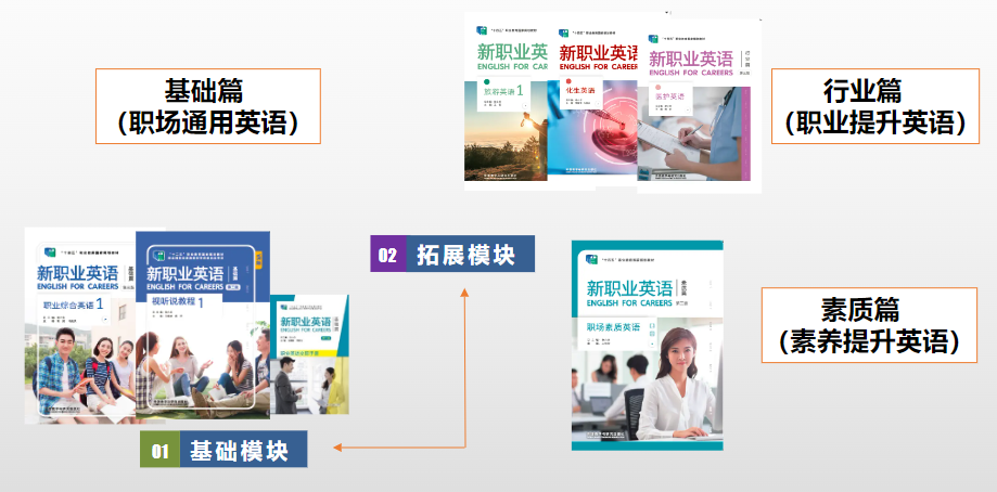 喜 报 《新职业英语》系列教材是由外语教学与研究出版社和深圳职业技术大学共同策划开发的一套高职公共英语教材,以“工学结合、能力为本”的职业教育理念为指导,以培养学生在未来工作中所需要的英语应用能力为目标,全面落实立德树人根本任务,有机融入课程思政理念,紧扣课标要求,真正体现高职公共英语教学的育人性、职业性和实践性。 基于高职教学实际与未来工作需求,《新职业英语》系列教材包含基础篇、行业篇(涉及15个行业)和素质篇三个模块,分别对应《高等职业教育专科英语课程标准(2021年版)》( 以下简称“新课标”)的基础模块和拓展模块,构成了一个系统完备的高职公共英语教学体系。此次,新职业英语基础篇、行业篇和素质篇均入选“十四五”职业教育国家规划教材。 基础篇 《新职业英语基础篇》涵盖不同职业涉外工作中共性的典型英语交际任务,以典型工作活动中需要的英语知识和技能为线索组织教学内容,培养学生职业英语应用能力,并为其进一步学习英语打好语言基础。“基础篇”包括《职业综合英语》《视听说教程》《职场基础英语》和《职业英语交际手册》。其中,《视听说教程(VR版)》配套VR数字课程,通过沉浸式场景,帮助学生更高效地了解、练习、掌握职场实际工作中涉及的核心表达,真正实现“可听、可视、可练、可互动”。《职业英语交际手册》是口语专项训练用书,突出口头交际能力的培养。 行业篇 《新职业英语行业篇》立足于高职院校各专业群所面向的行业,依据企业的工作流程、典型工作环节或场景设计教学内容,力求使学生具备在本行业领域内运用英语进行基本交流的能力,包括《机电英语》《IT英语》《经贸英语》《医护英语》《汽车英语》《旅游英语》《土建英语》《化生英语》《物流英语》《市场营销英语》《轨道交通英语》等15个专业大类。 素质篇 《新职业英语素质篇》旨在提高学生的综合素质,兼顾学生社会发展的需求和个性发展的需要。教材在帮助学生打好语言基础、训练语言技能的同时,注重对学生职场素质方面的培养,强化涉外交际能力,拓展多种思维方式,从而实现其全面发展。 教学资源 《新职业英语》系列教材根据各教学环节的需要,配备教师用书(纸质或电子版)、评估手册、助教课件、思政教案、音频资源、各类数字课程(U校园数字课程、随身学数字课程和VR课程)以及慕课和国家在线精品课程,提供合理的教学建议与丰富的视频等辅助资源,以方便教师备课与授课,促进教师与学生之间的互动与交流。 扫码获取《新职业英语》配套资源 《新职业英语》系列教材以“工学结合、能力为本”的职业教育理念为指导,基于高职教学实际与未来工作的实际需求,助力职业院校培养高素质技术技能人才。我们相信,《新职业英语》系列教材必将为我国高等职业教育外语教学改革助力,为我国职业教育发展赋能。 征订信息 点击查看《新职业英语》宣传片 扫码查看《新职业英语》宣传册 相关阅读 精品教材|《新职业英语》:紧扣新课标,引领新态势