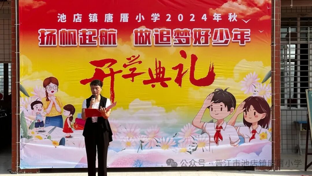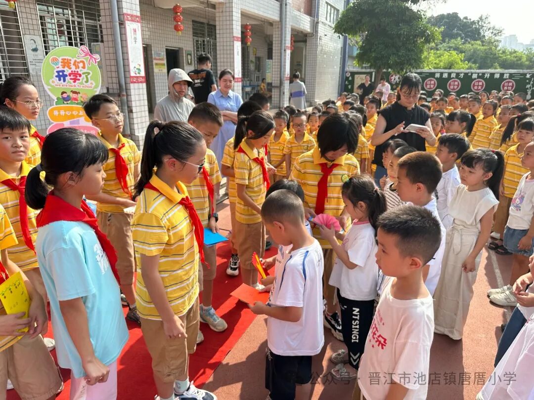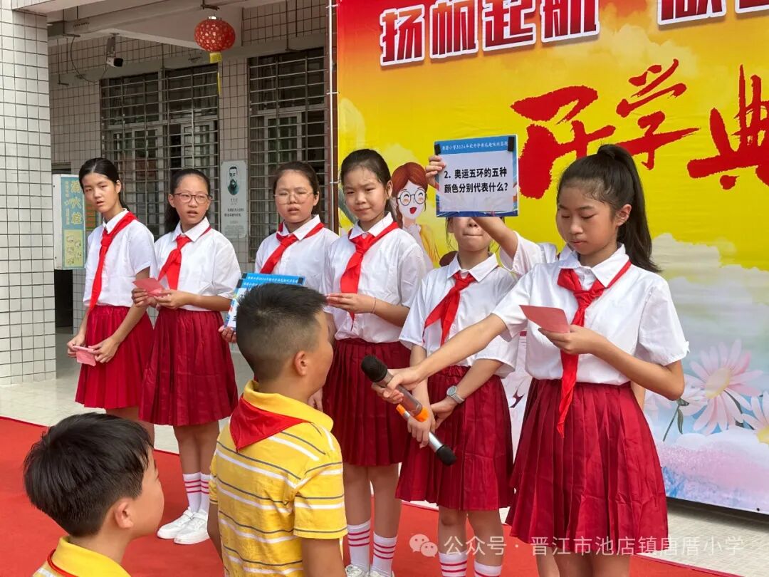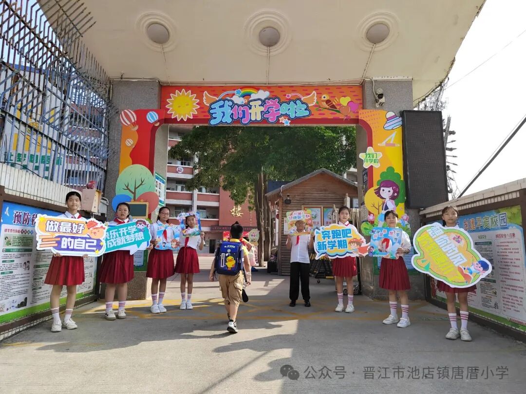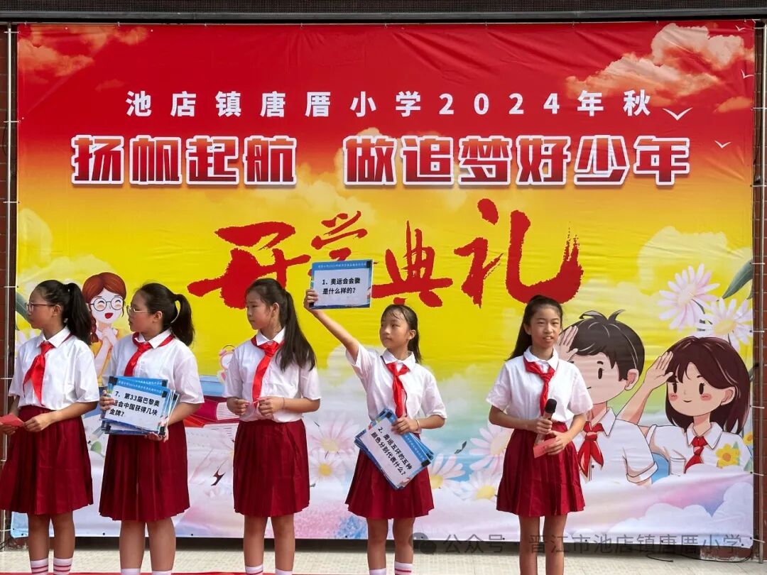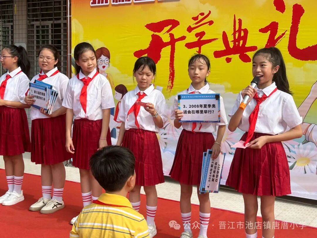 2024年9月2日 开学啦 TERM BEGINS 秋风送爽丹桂馥,书声琅琅新梦启。伴随着天高云淡的金秋,我们怀着共同的理想,带着对美好未来的憧憬,共同开启新学期新篇章。9月2日上午,唐厝小学全体师生相聚在美丽的校园,隆重举行“扬帆起航 做追梦好少年”开学典礼。 一、开学典礼前 学校领导、护导老师及大队委员早早地来到学校,热情迎接孩子们的到来。经过老师们的精心布置,校园处处充满着热情和期待,孩子们走进迎新门,也走进人生的新篇章。 一年级的教室内,校领导、老师们新生点朱砂于额头正中,寓意开启智慧,明心见性。 二、开学典礼时 1.升旗仪式 伴随着激昂的《义勇军进行曲》,鲜艳的五星红旗在全体师生的注目下冉冉升起,飘扬在学校的上空。 追梦起航 2.校长致辞 唐厝小学李雪玲校长为开幕式致辞。她从梦想与追求、学习与成长、团结与合作、责任与担当、安全与健康五个方面鼓励同学们要勇于青云直上,要敢于拼搏,用智慧和汗水书写自己的精彩篇章。 3.欢迎新生 六年级学生给一年级学生赠送祝福卡。小小的祝福卡承载着六年级哥哥姐姐们给弟弟妹妹们的美好祝愿。 4.互动活动:奥运精神我传承 (1)党员代表吴达玲老师以《努力做祖国和人民需要的好孩子》为题进行宣讲。她希望队员们能以奥运冠军为榜样,努力成长为爱党爱国、奋发向上的新时代好少年。 (2)奥运知识竞答环节将开学典礼推向了高潮。大队委提问,同学们抢答,一问一答间将爱国精神根植于孩子们的心中。 5.立下志向 展望未来 (1)节目《我们都有梦想》 孩子们用精彩的朗诵和舞蹈,表达了对祖国的热爱和为强国而努力学习的决心。 (2)制定新学年目标卡 孩子们在新学年目标卡上写下自己新学期的小目标,字里行间尽是对新学期的期盼。 开学典礼结束后,各中队分别进行开学第一课。各中队老师们以饱满的热情和生动的方式,对孩子们进行安全、文明礼仪、行为习惯等主题教育。 风华正茂心似火,拼搏进取无止境。祝愿唐厝小学的学子们在新的学期里不惧风雨,乘风破浪,于书山之上顾盼飒爽身姿,于学海之中见证时代辉煌。![]()
